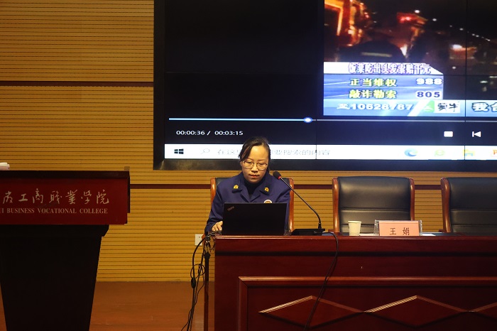 第四十七期工商大讲堂由长丰县消防大队王娟主讲,她围绕今年11.9消防安全月主题 “落实消防责任,防范安全风险”, 结合典型消防案例,以案说法,就各类场所消防隐患及排除办法进行讲解,对校园常见火灾隐患排查、灭火器及消火栓的使用方法进行介绍,针对学生宿舍、实验实训室、食堂等重点等场所消防隐患及逃生知识进行了特别提醒,希望师生员工牢固树立消防意识,提升消防扑救和逃生技能,确保平安。