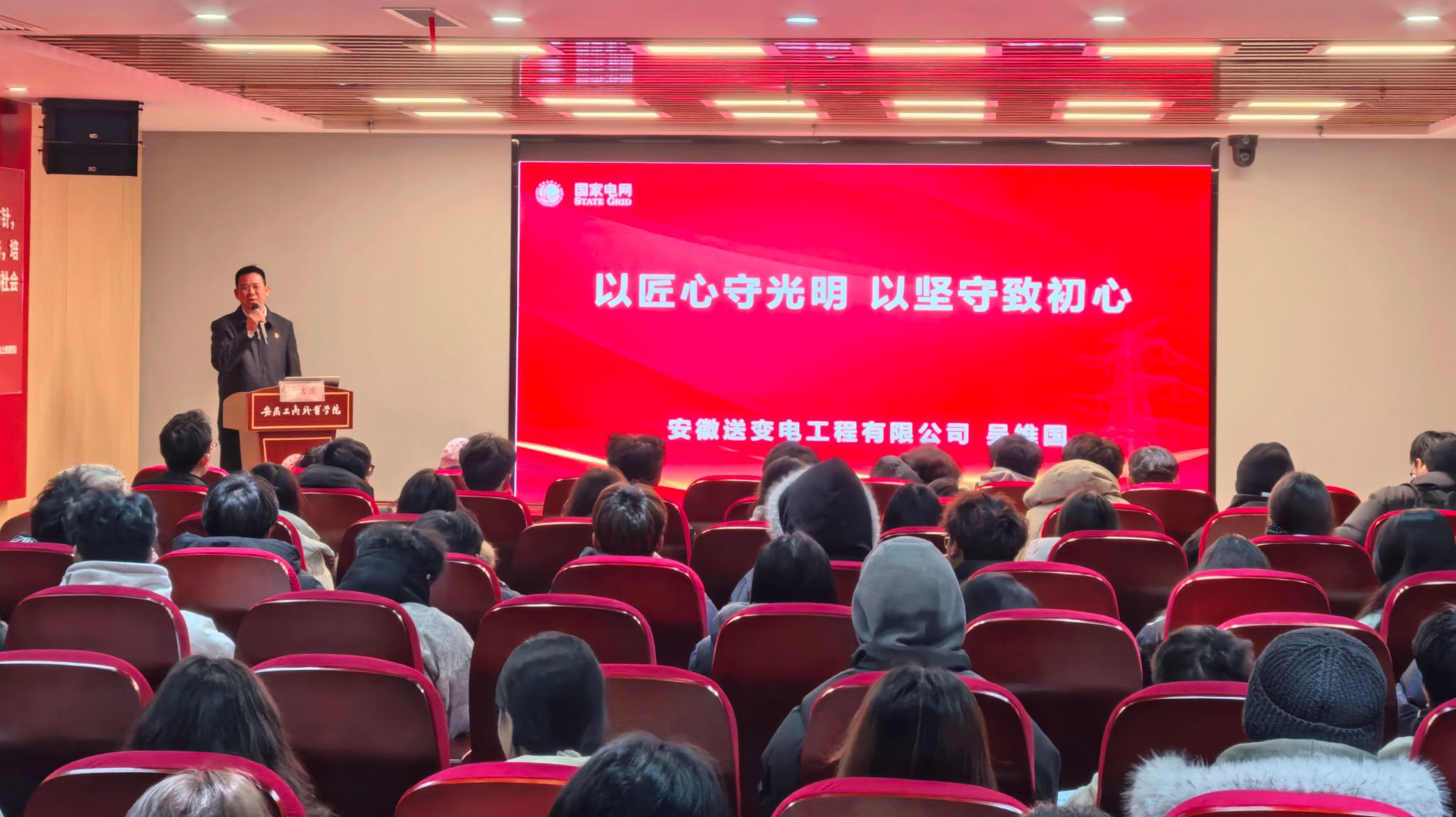 为深入学习贯彻党的二十届四中全会精神,坚定技能报国理想,积极践行劳模精神、劳动精神、工匠精神。1月6日下午,安徽工商职业学院“英模·大师进思政课堂”暨第五十八期“工商大讲堂”在红色报告厅举行。报告特邀全国五一劳动奖章获得者、安徽送变电工程有限公司带电班班长、±1100kv电压等级带电作业世界第一人吴维国同志,为师生们带来了一场题为《以匠心守光明 以坚守致初心》感人至深的宣讲。