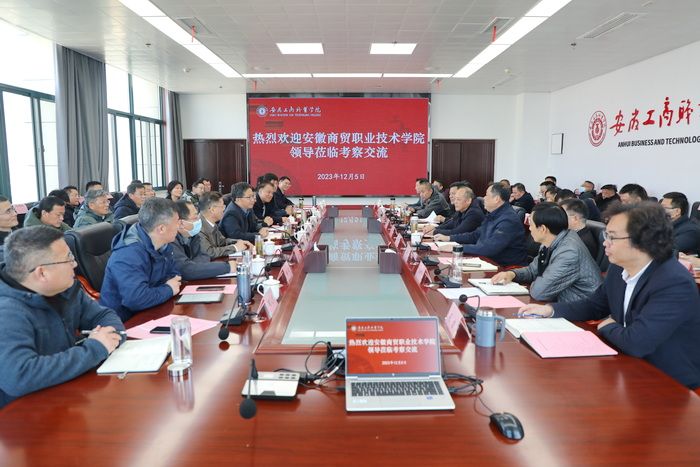 12月5日上午,安徽商贸职业技术学院党委书记曾黎明,党委副书记王炜,党委委员、副院长郑承志,党委委员、纪委书记黄继胜带领学校相关部门负责同志来校调研。校领导齐建平、李雪、陈行、胡捍东、陈章奇、吴松飞出席,相关部门负责同志参加座谈交流,会议由党委书记齐建平主持。