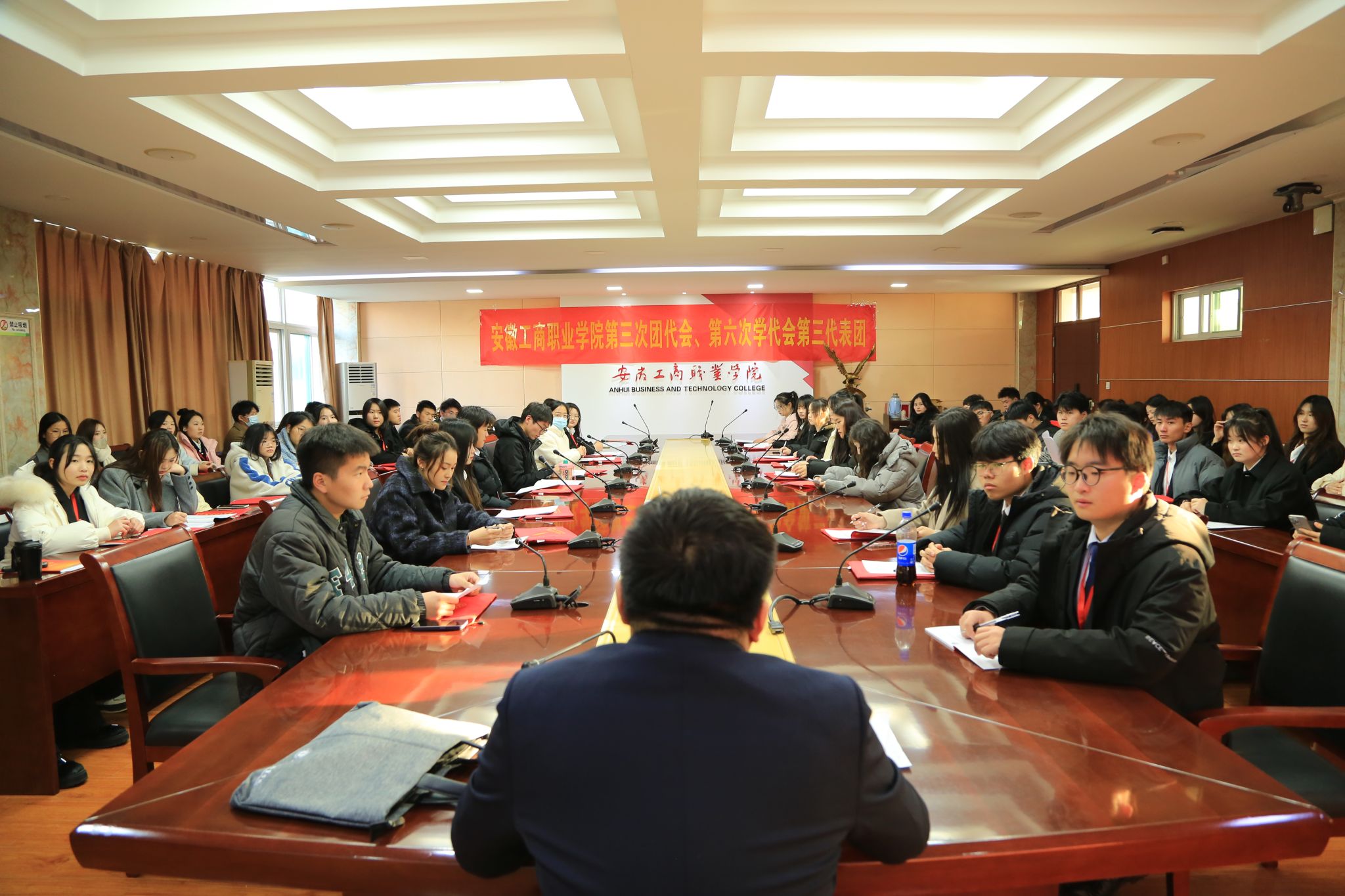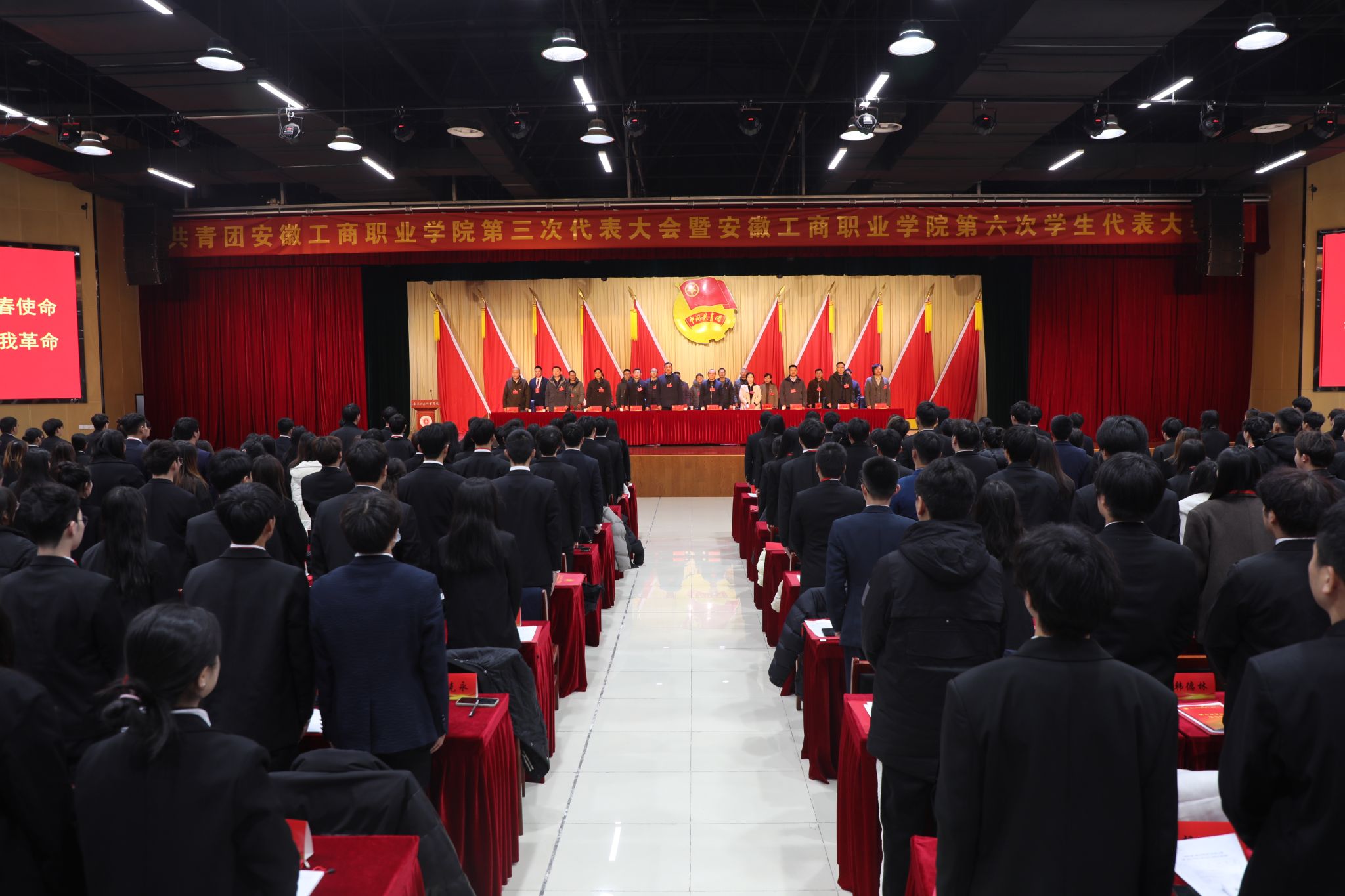 2023年12月16日,共青团安徽工商职业学院第三次代表大会暨安徽工商职业学院第六次学生代表大会在大学生活动中心隆重开幕。省直团工委副书记盛子珈、党委书记齐建平出席会议并讲话。党委领导李雪、陈行、胡捍东、陈章奇、吴松飞、刘浩、孔成、朱小龙出席开幕式,269名团学代表参加大会。