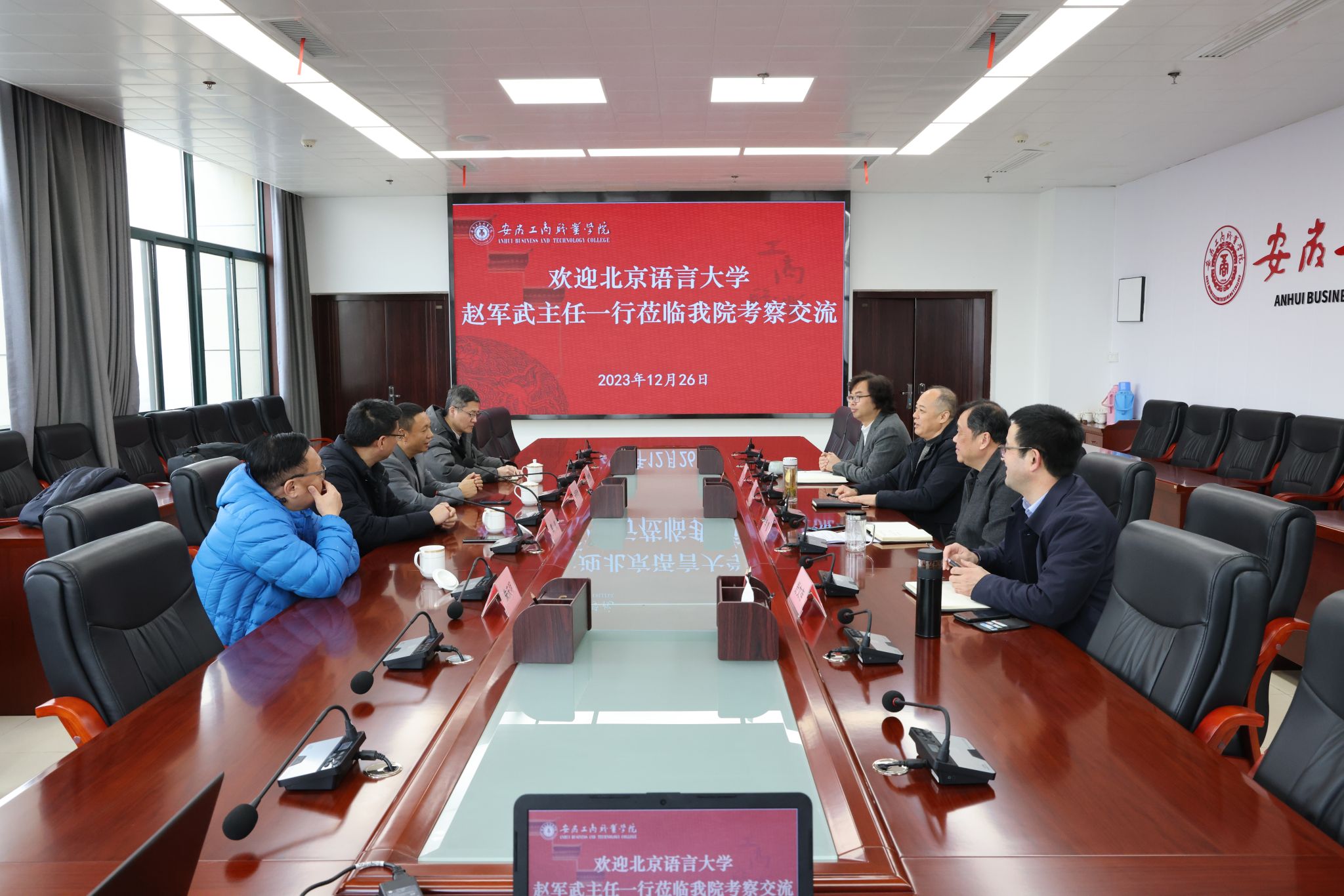 赵军武感谢校领导的热情接待,他表示,北京语言大学留学服务中心有限公司隶属于北京语言大学,是教育部批准的少数具有出国留学资质的机构,目前已与法国、意大利、西班牙、德国等50多个国家和地区的270多所高校建立了业务关系。本次来访主要是推进北京语言大学与安徽省开展合作试点工作的前期调研,他希望能与我院开展全面合作,推动我院学生国际化培养、教师学历提升等方面事业的发展。