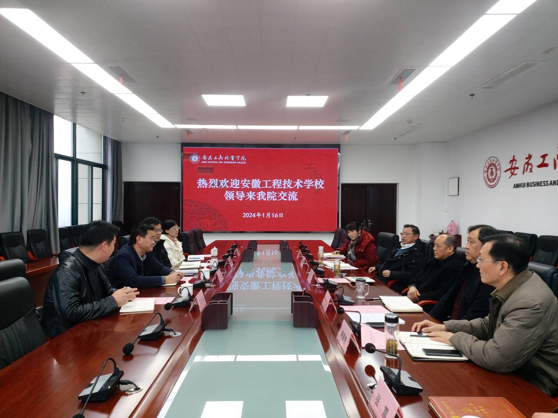 1月16日上午,安徽工程技术学校党委书记、校长王绍卫,党委委员、副校长唐峰、刘大威一行四人来校考察交流,就进一步落实高职联合培养、高职中专分校建设等事宜进行洽谈。党委书记齐建平,党委副书记、院长李雪,党委委员、副院长胡捍东、陈章奇热情接待了王绍卫一行。