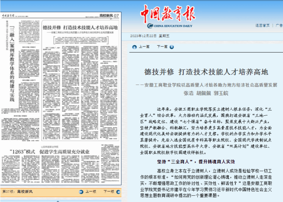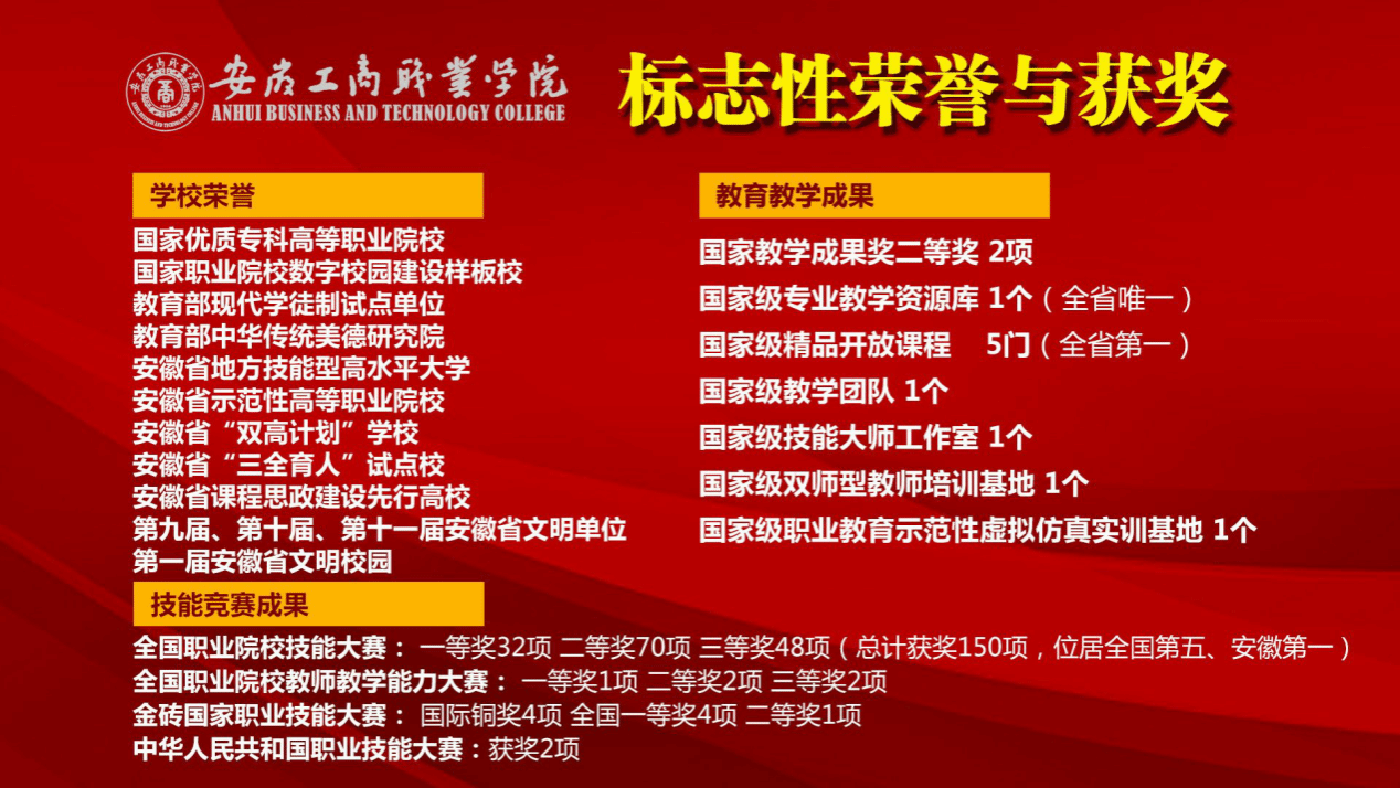 ——省级标志性成果100余项:省级教学成果特等奖3项、省教学成果一等奖32项,“三大讲堂”育人模式获省直机关优秀品牌工作案例,学校获安徽省地方技能型高水平大学、安徽省示范性高等职业院校、安徽省高职发展标杆校、安徽省技能大赛标杆校、安徽省线上教学示范校、第九届、第十届、第十一届安徽省文明单位、安徽省文明校园,校领导班子连续六年获省属高职年度考核“优秀”等次,学校获省首批党建工作标杆院系、样板支部单位等。
