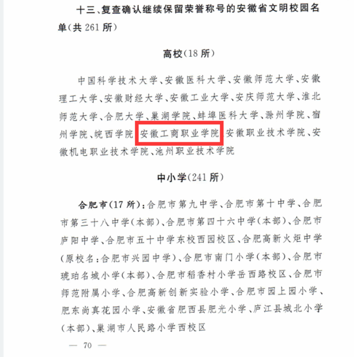 一直以来,学校坚持以习近平新时代中国特色社会主义思想为指导,坚持文明创建与事业发展同步、常态创建与长效机制并重、校园文明与师生素质共进,以“六个好”为标准,以三全育人为抓手,将文明创建工作作为“一把手”工程,聚焦立德树人根本任务,不断深化思想道德、领导班子、师德师风、校园文化、校园环境、各类阵地等建设,以文明校园创建成效助推学校高质量发展。学校曾获得安徽省第九届、第十届、第十一届文明单位,安徽省第一届文明校园、安徽省第一届教育系统文明单位、安徽省绿色学校、合肥市第三届文明校园、合肥市第十二届、第十三届、第十四届文明单位等荣誉。