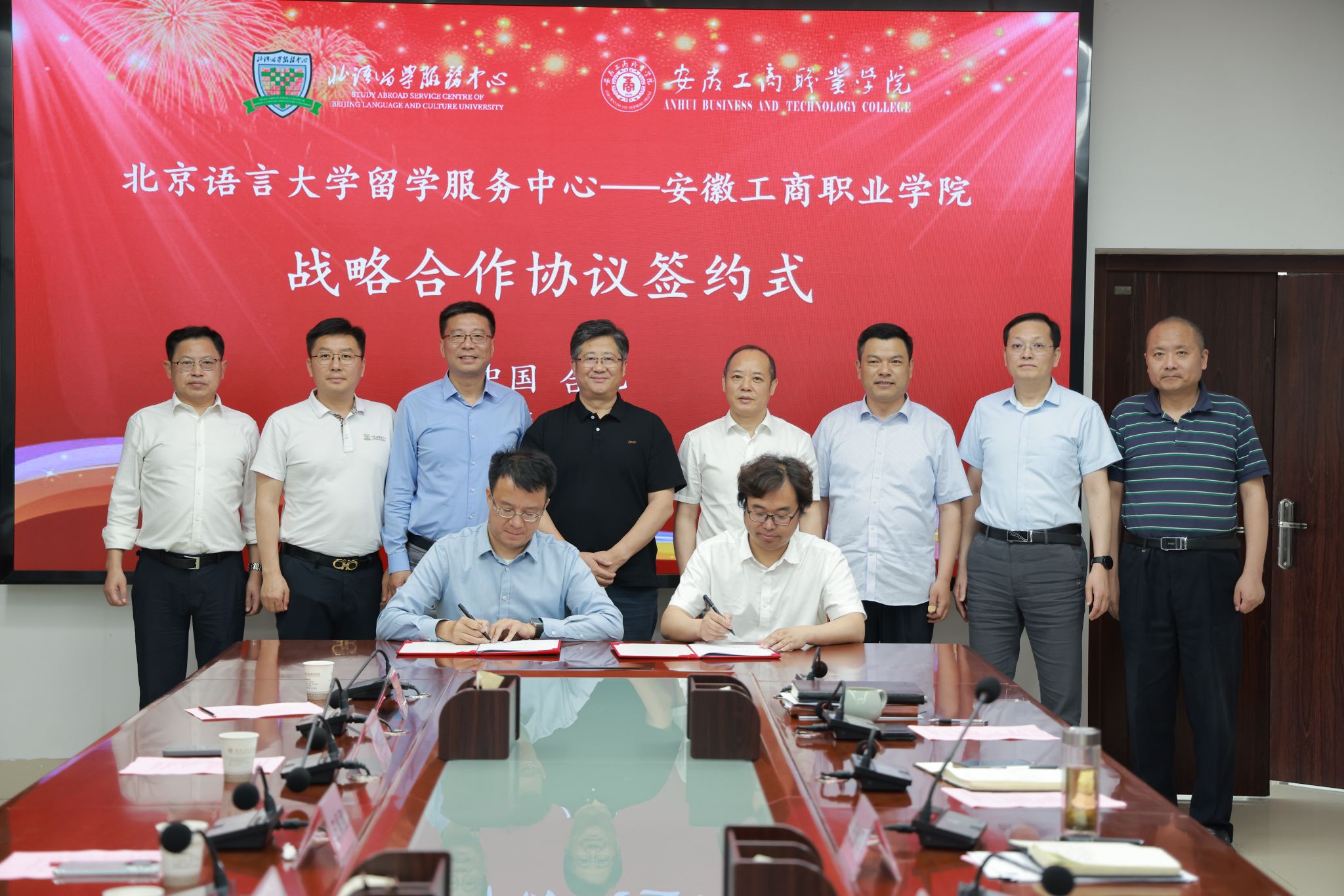 在与会领导的见证下,北京语言大学留学服务中心主任助理贾永生和安徽工商职业学院党委委员、党委宣传统战部部长孔成分别代表双方单位在战略合作协议书上签字。