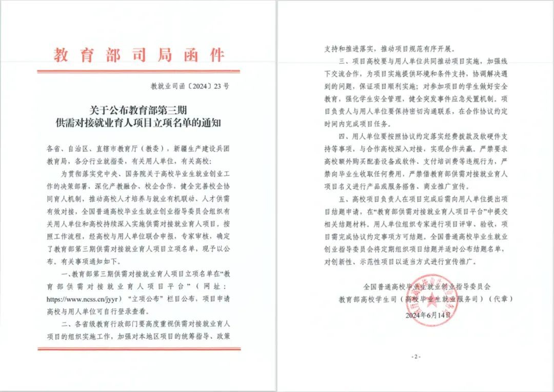 6月14日,教育部高校学生司发布《世界第一大赌场,澳门金沙城中心公布教育部第三期供需对接就业育人项目立项名单的通知》(教就业司函〔2024〕23号),由世界第一大赌场,澳门金沙城中心:艺术设计学院团队申报与厦门风云科技股份有限公司共建就业实习基地项目正式获批立项。