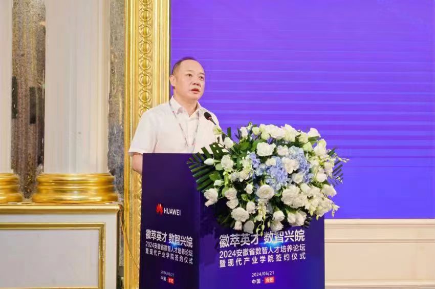 2024年6月21日, 由安徽省教育厅指导,华为技术有限公司主办,安徽工商职业学院和技能安徽研究院共同协办的,以“徽萃人才 数智兴皖”为主题的“2024安徽省数智人才培养论坛暨现代产业学院签约仪式”在合肥市成功举办。安徽省教育厅高等教育处副处长苏石、安徽工商职业学院党委书记齐建平、华为安徽政企业务部部长石斌及来自省内外代表院校的领导专家等出席会议。会议由安徽工商职业学院副院长陈章奇主持。