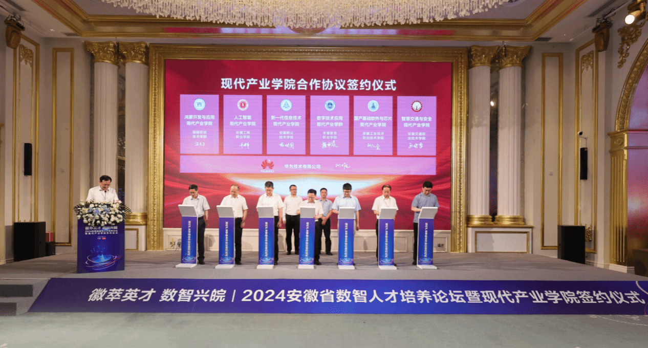 在安徽省教育厅的见证下,华为与安徽工商职业学院、铜陵职业技术学院、安徽职业技术学院、安徽警官职业学院、安徽工业经济职业技术学院、安徽交通职业技术学院共同进行了现代产业学院合作协议签约仪式,这是华为在安徽省全力推进数智人才培养的重要里程碑,为加快建设英才荟萃的人才强省持续贡献力量。