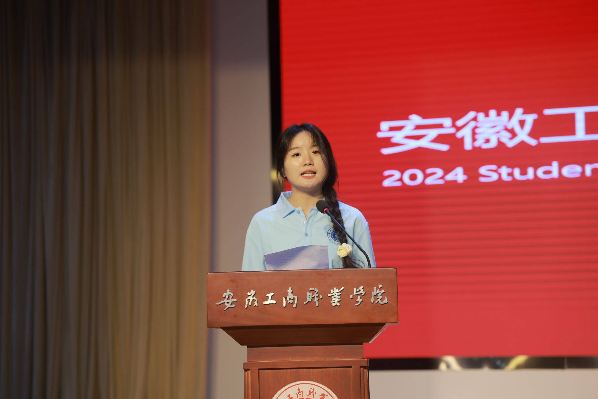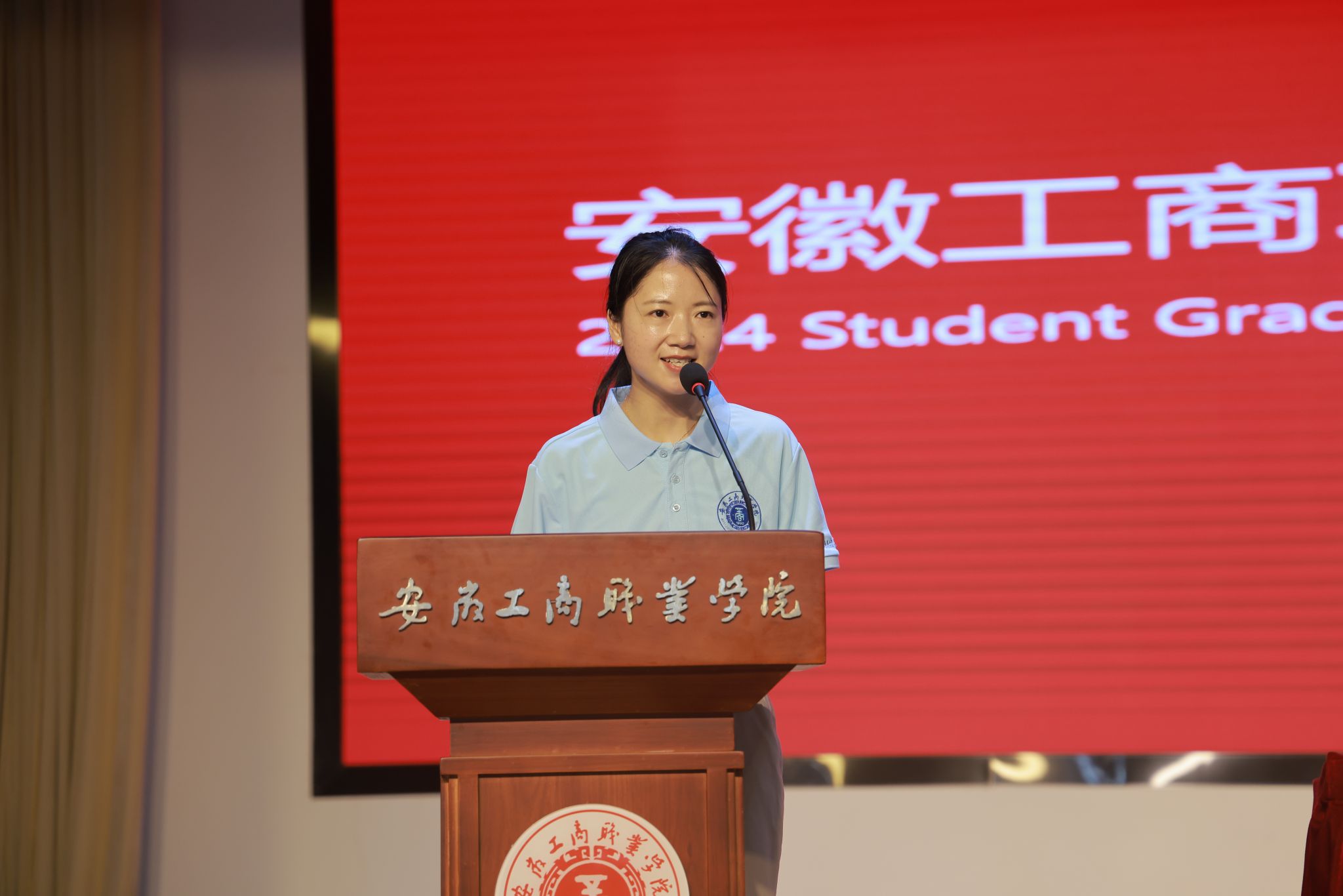 经济贸易学院辅导员杨玉娇作为教师代表发言。她回忆了和毕业生们相处的美好时光,叮嘱毕业生怀揣美好梦想,充满坚定信心,将个人的理想融入国家的发展大局之中,用智慧和汗水书写属于这个时代的辉煌篇章。