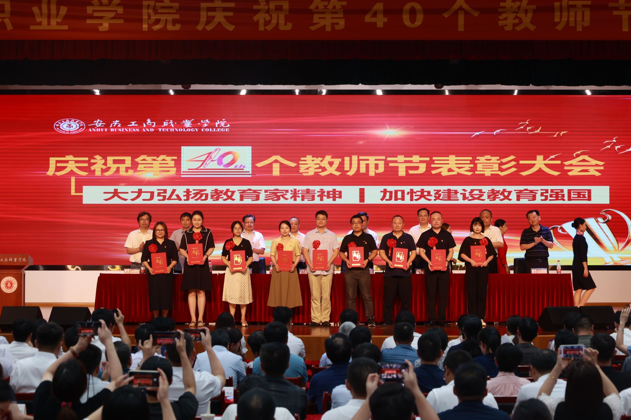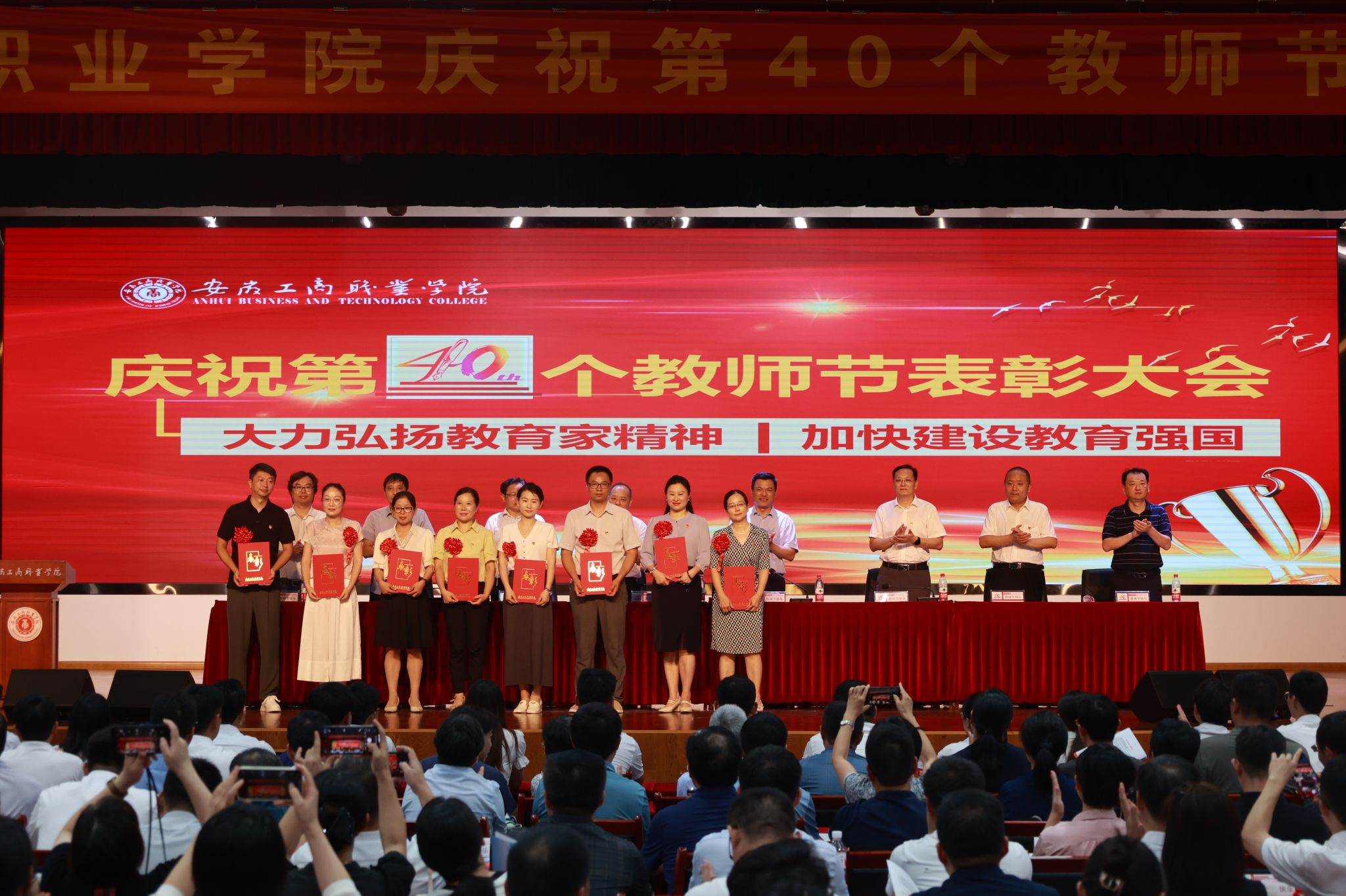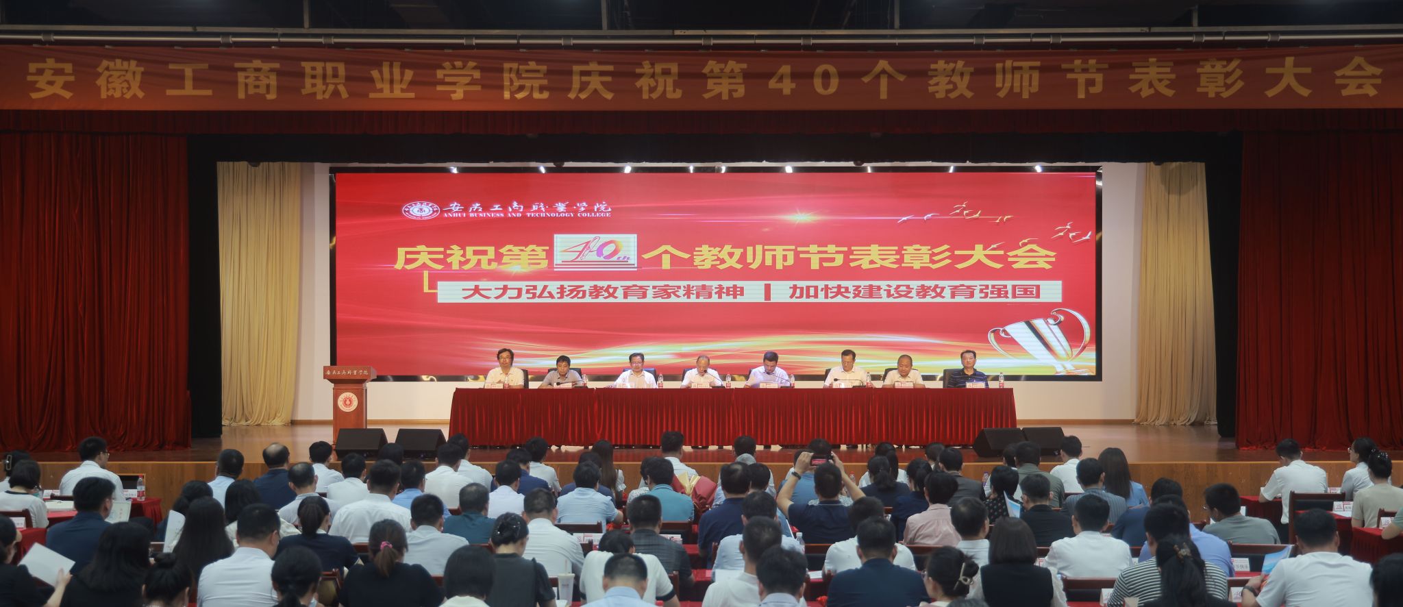 9月10日下午,学校在双凤校区大学生活动中心举行“大力弘扬教育家精神,加快建设教育强国”----安徽工商职业学院庆祝第40个教师节表彰大会。校党政领导班子、全体教职工和部分学生代表参加大会,大会由校党委副书记陈行主持。