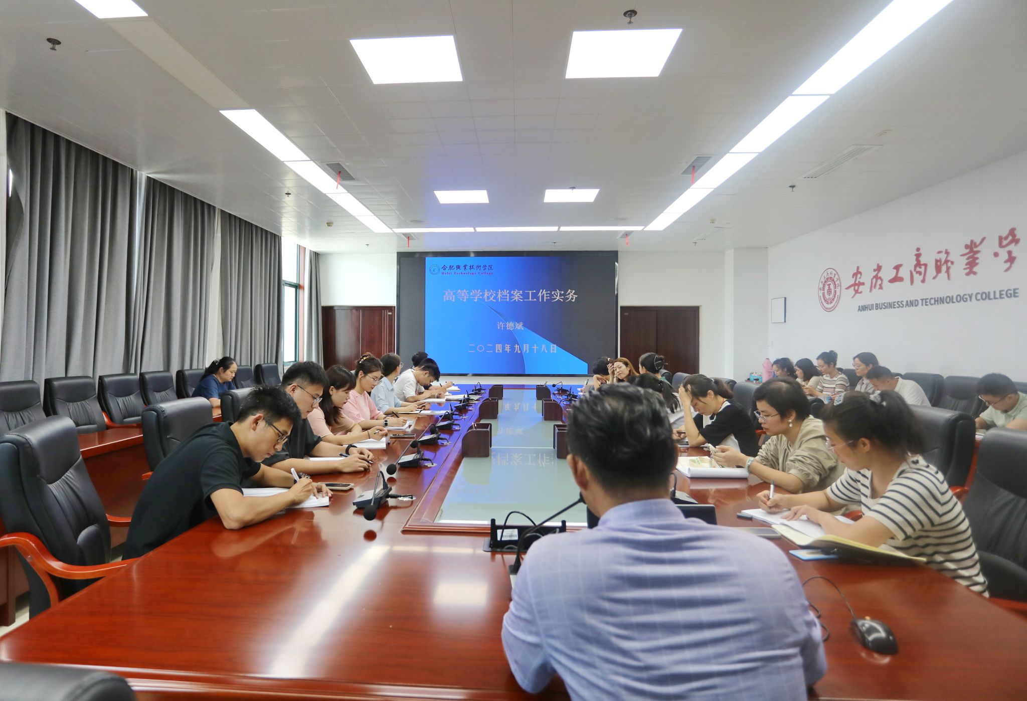 培训会邀请合肥职业技术学院综合档案室主任许德斌主讲。许德斌重点从高等学校档案实体分类法、高等学校档案分类主表及档号编制规则、高等学校各门类档案归档范围和保管期限、高等学校文书档案整理工作流程四个方面,讲授了档案收集、分类、整理等工作的相关业务知识和技能。