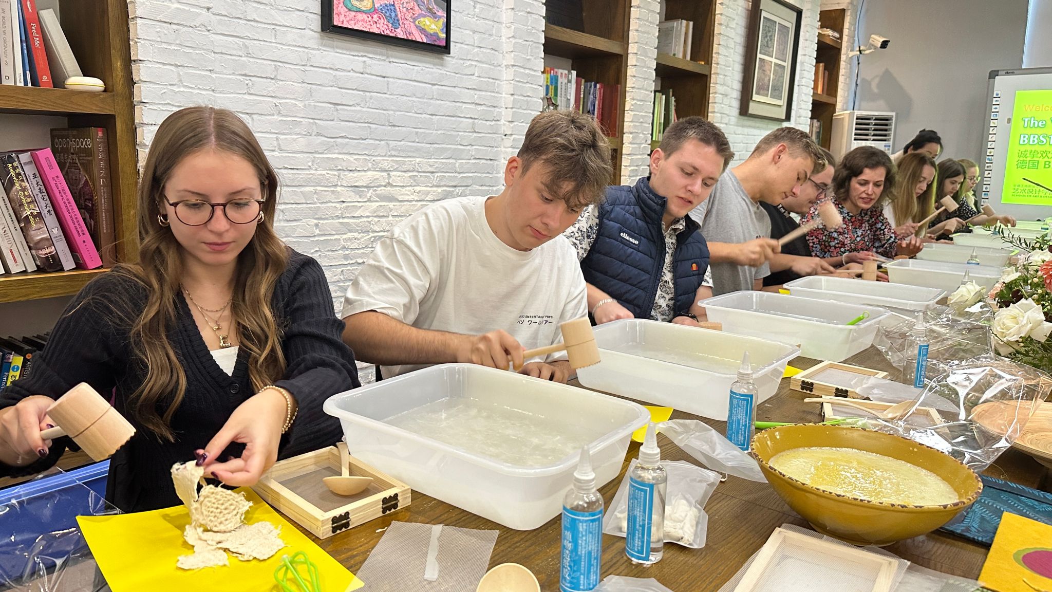 在接下来的行程中,交流团体验人工智能与虚拟仿真中心、信息仿真一体机3D资源实训中心,参观了荣事达智能文旅仓、智能家居实践基地,在艺术设计学院访问团师生体验了中国非遗古法花草纸的制作过程。此次访问让交流团成员对学院的教育理念和教学成果有了更深入的了解,德国师生对学校实训设备的先进性和实用性给予了高度评价,并通过体验中国非物质文化遗产,对中国文化有了更直观的认识。