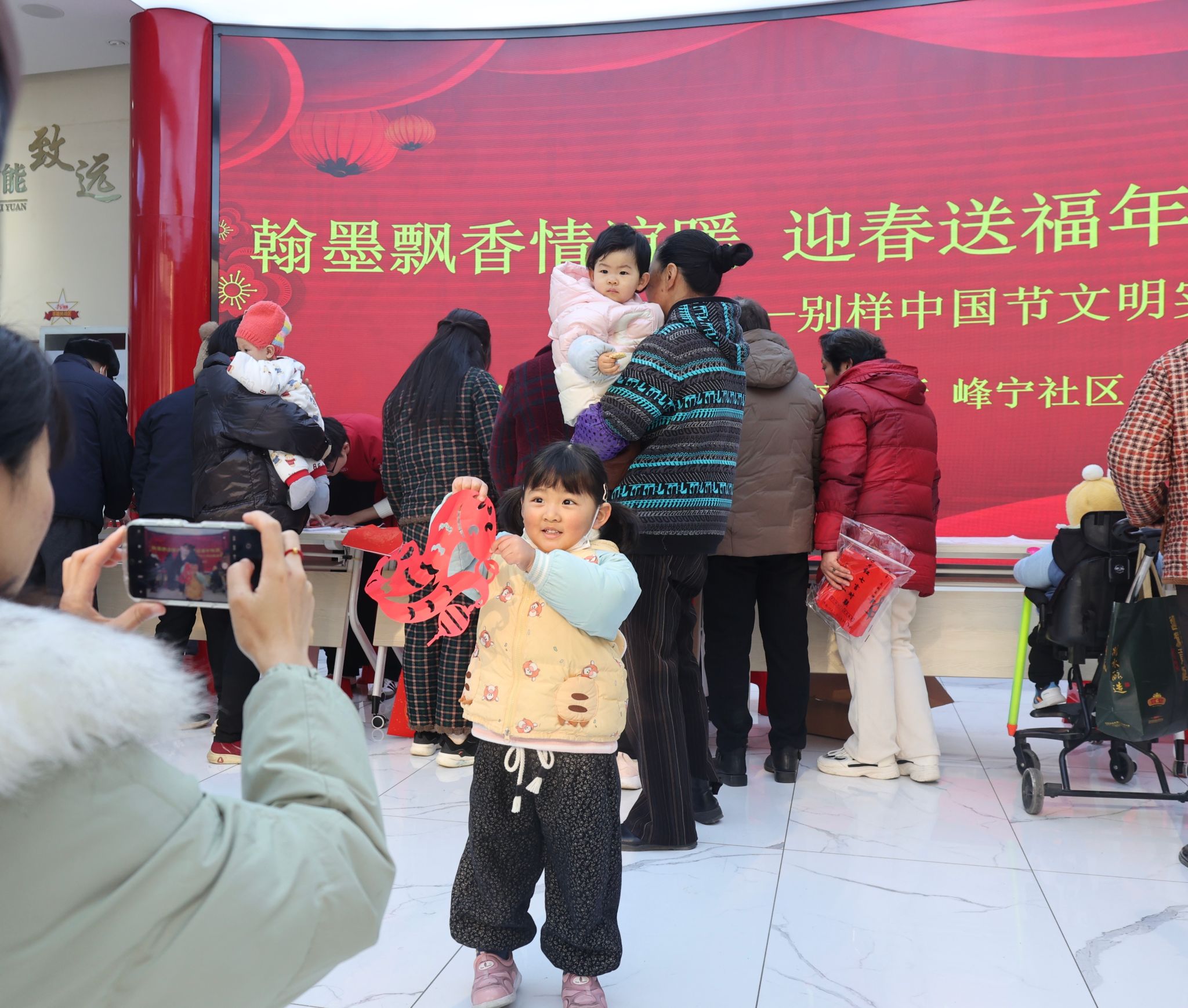 本次进社区文化活动亮点纷呈,趣味满满的猜谚语环节、热闹民俗味十足的剪纸活动也吸睛无数。社员们指尖飞剪,纸屑纷舞间,各类精美的画样便跃然纸上,引得围观群众连连称赞。活动现场还设置了互动环节,居民们可以现场提出自己想要的春联内容,由沉屑书画社的成员们即兴创作,这一环节让大家的参与感更强,欢声笑语不断。还有书法爱好者现场教学,手把手教小朋友们写简单的福字,让传统文化的种子在孩子们心中生根发芽。