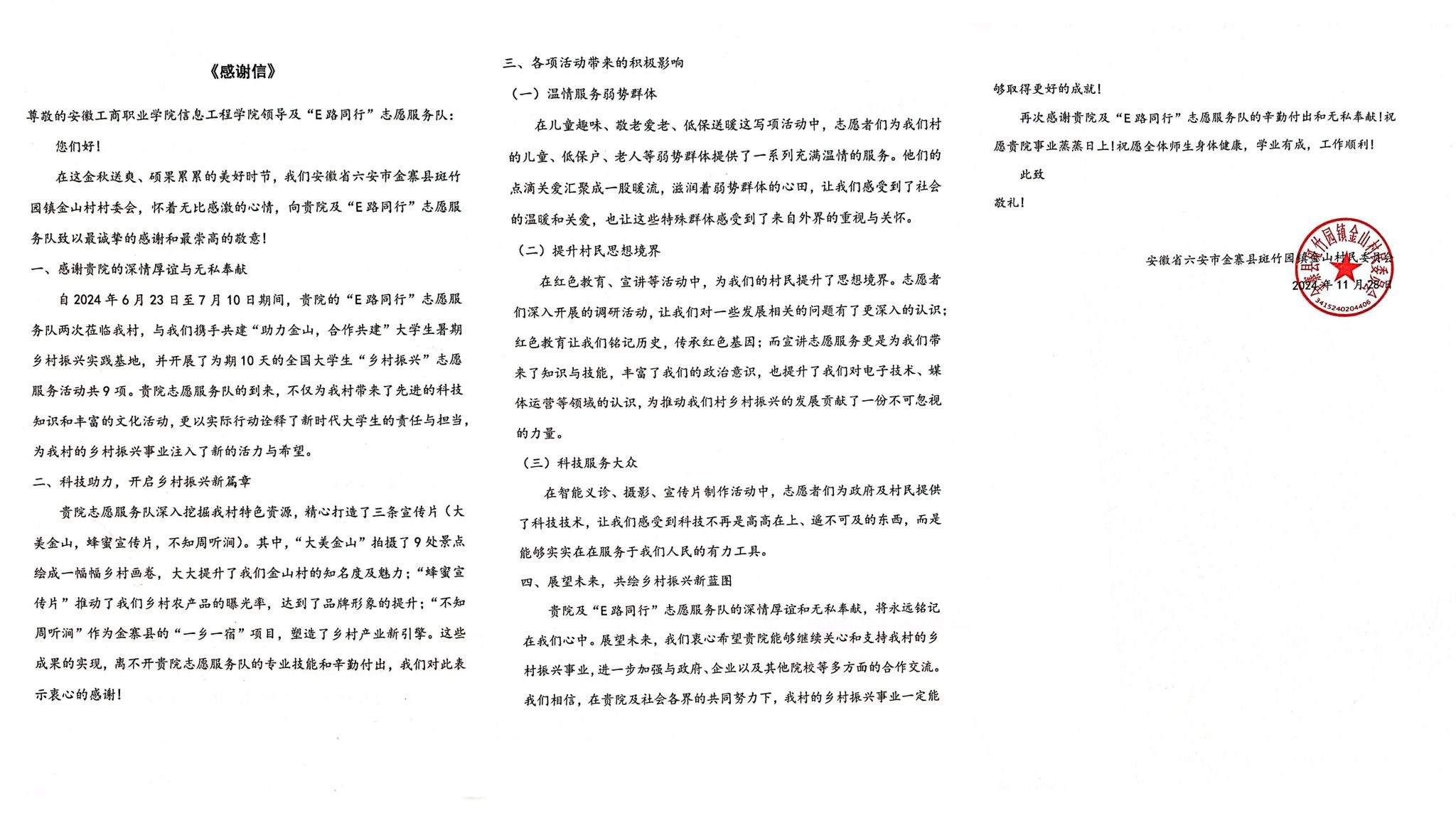2025年1月,信息工程学院暑期“三下乡”社会实践活动团队“E路同行”志愿服务队,凭借出色的表现,在全国大学生“乡村振兴”志愿服务团队评比中,荣获“优秀团队”,晋级全国百强。