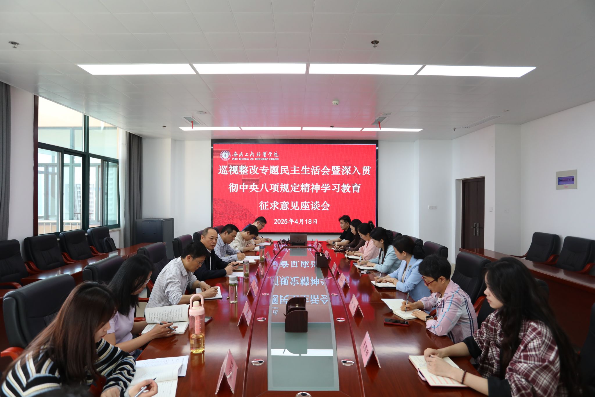 2025年4月18日上午,学校在综合楼第一会议室召开巡视整改专题民主生活会暨深入贯彻中央八项规定精神学习教育征求意见座谈会。党委书记齐建平、党委副书记陈行出席座谈会,党员干部教师、民主党派人士、辅导员、学生代表等参加会议,巡视整改办公室、学习教育办公室部分工作人员列席会议。