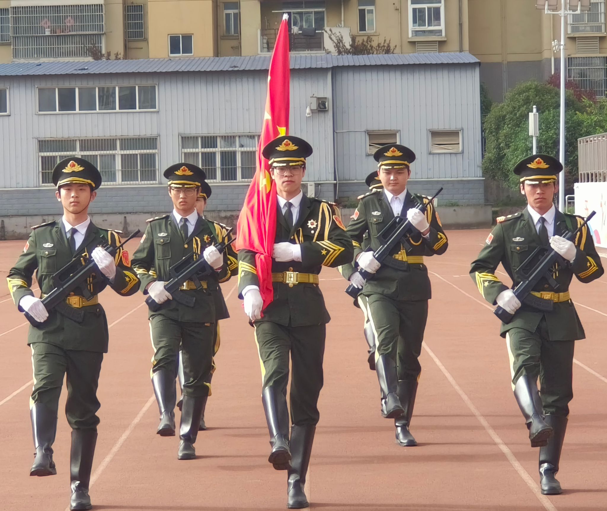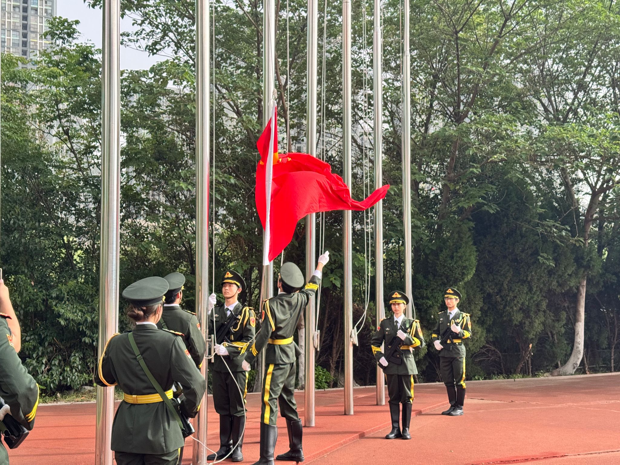 晨光初绽,国旗护卫队步伐铿锵,护卫五星红旗走向升旗台。随着激昂的《义勇军进行曲》奏响,红旗冉冉升起,全体师生肃穆而立,目光追随着国旗,心中满是对祖国的热爱与对五四精神的崇敬。