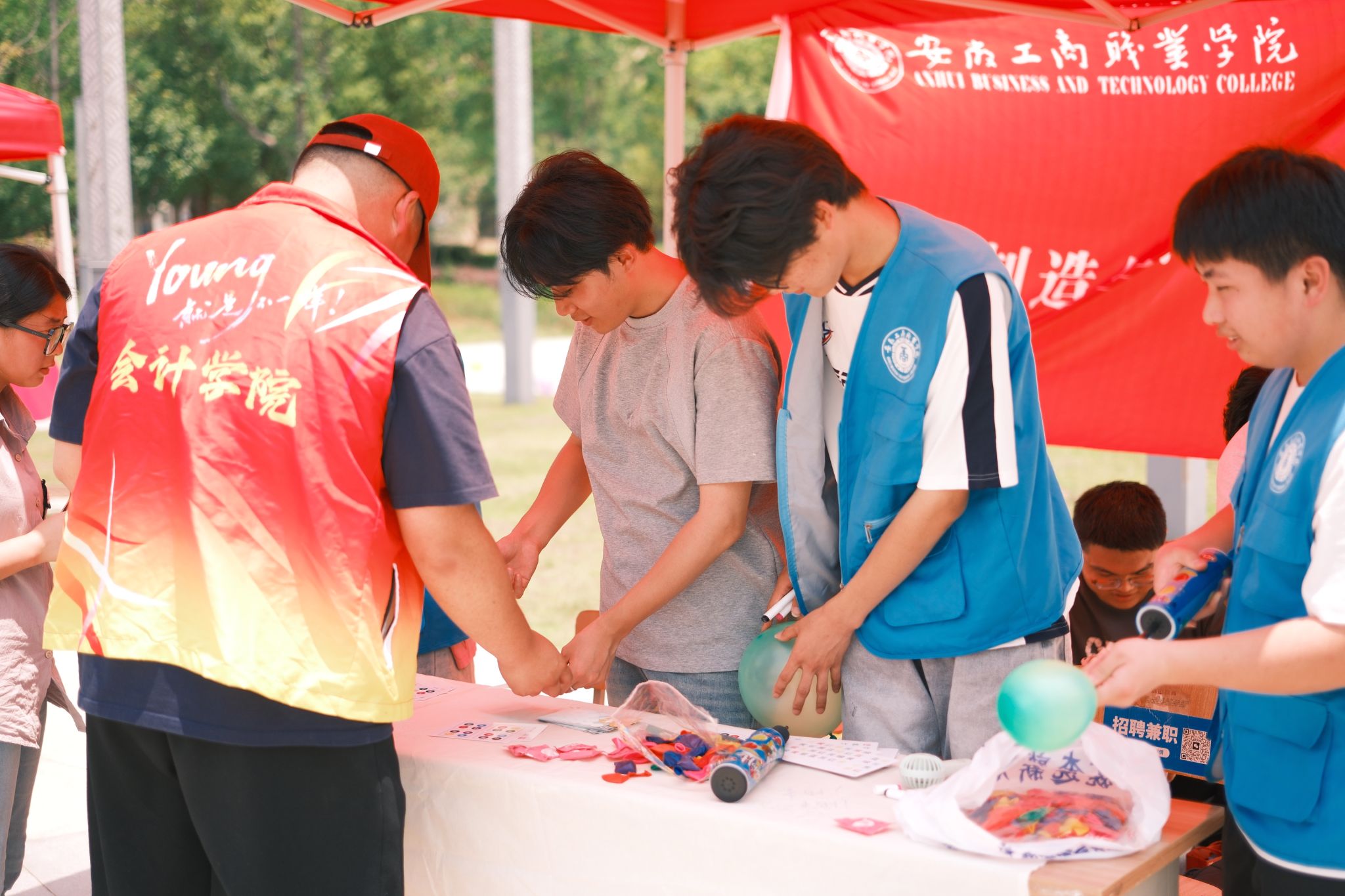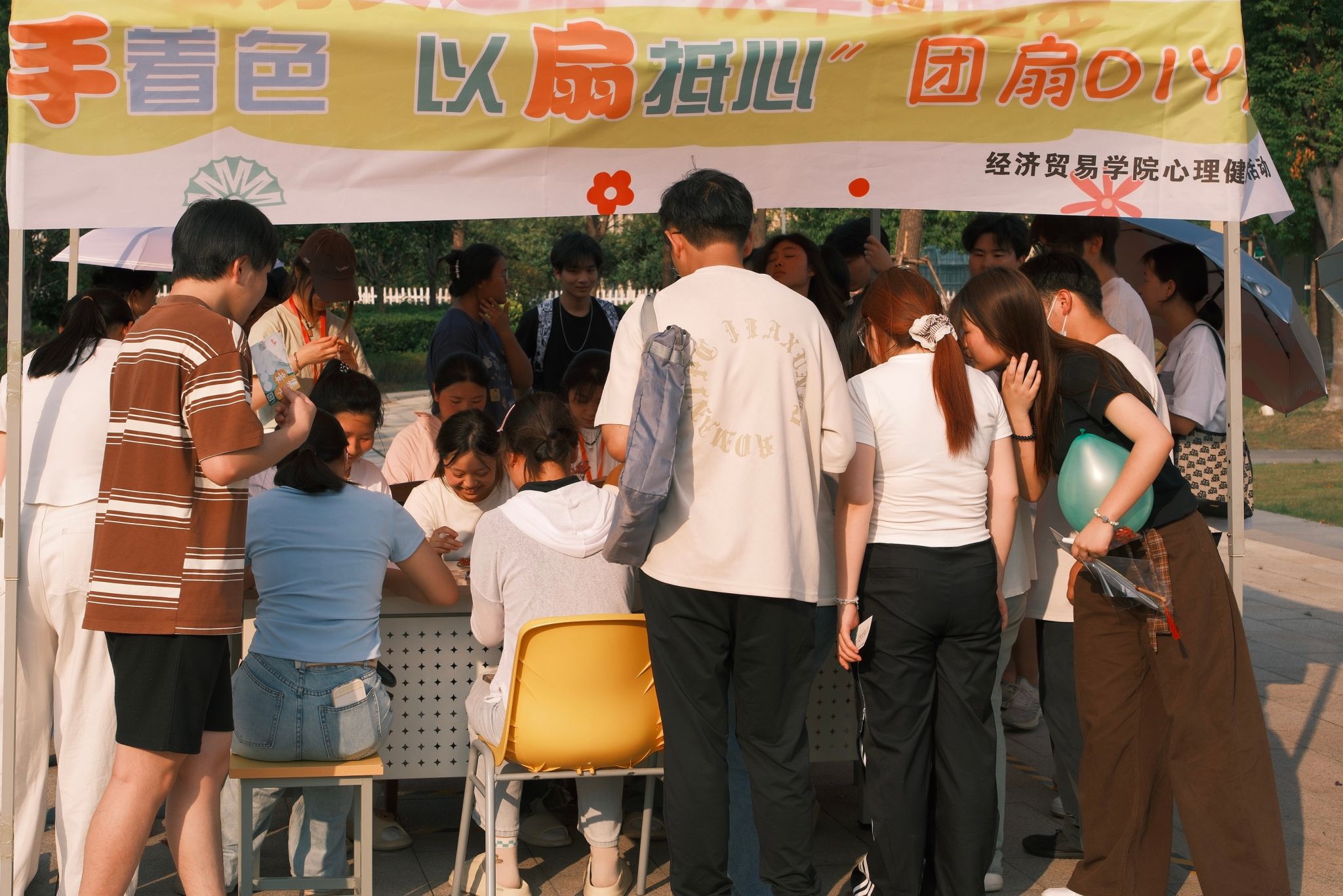 心理健康教育中心携手二级学院匠心打造了九大主题摊位、十款趣味心理游戏,将专业性与趣味性深度融合。心理健康教育中心推出“花式心理知识问答”普及常识,设计“丢掉包袱”挑战,让参与者把压力写进沙包,一掷卸负,直呼 “轻松”;校心理协会以“情绪盲盒”传递暖心语录,借“温情传递”收集陌生人祝福,点亮善意微光。各学院的特色活动同样精彩纷呈:管理学院发起“给明年的自己一封信”,承载学子对未来的憧憬;艺术设计学院开展“漆彩纷呈,扇染心色” 漆扇制作,以艺术疗愈释放情绪;智能制造与汽车学院组织“情绪气球互换”,用踩爆气球的仪式感完成情绪宣泄;会计学院的投壶飞镖、旅游健康学院的“心语心愿”漂流瓶、经济贸易学院的团扇 DIY与 STROOP测试等,也吸引众多同学踊跃参与。
