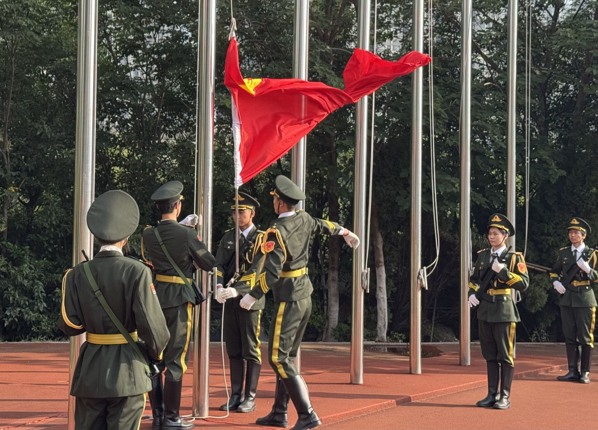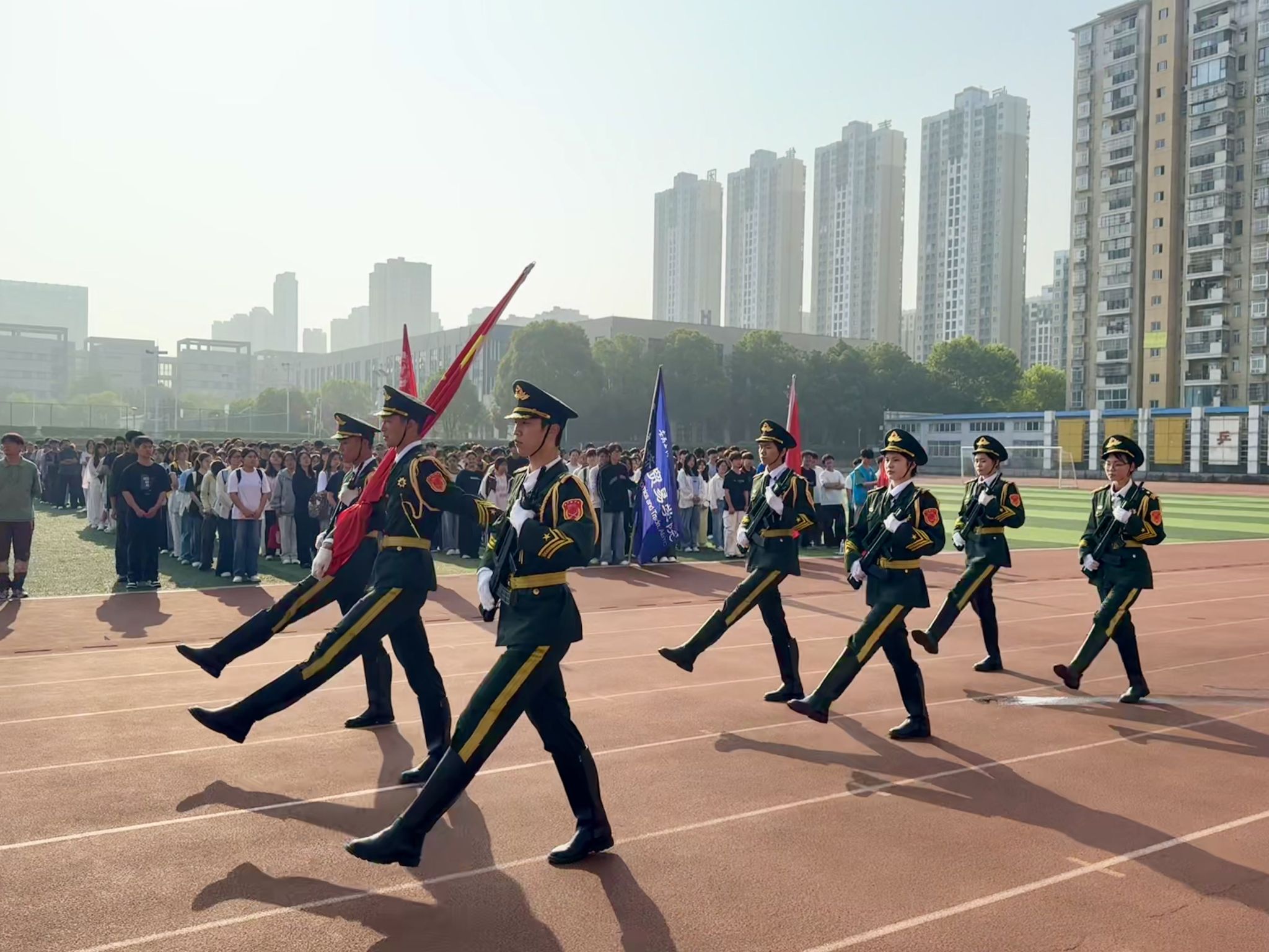 晨光初露,国旗护卫队迈着铿锵有力的步伐护送国旗入场。伴随着雄壮激昂的《义勇军进行曲》,五星红旗冉冉升起,全体师生庄严肃立,齐唱国歌,向国旗行注目礼,展现出对祖国的无限敬意与热爱。