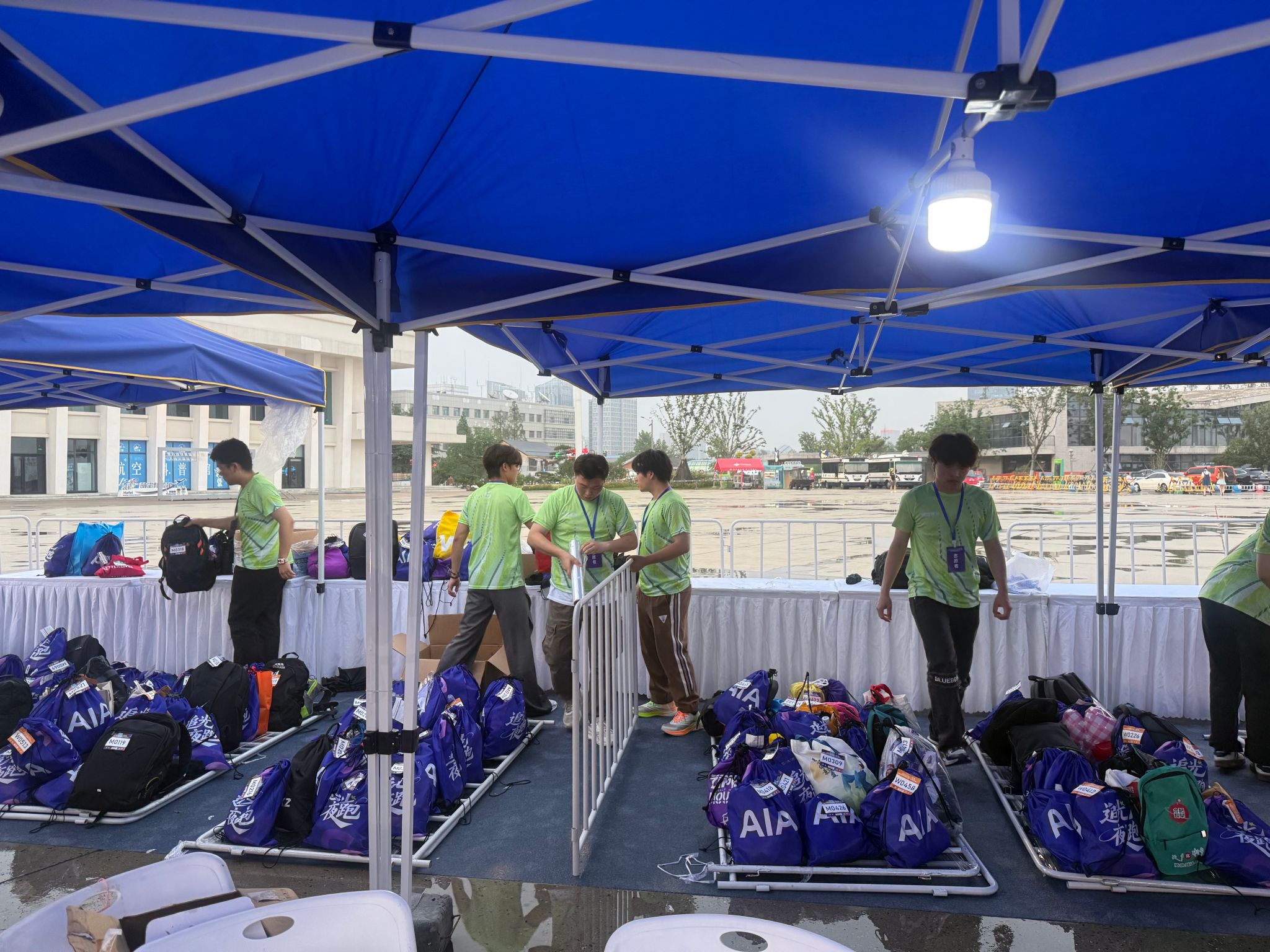 活动当天,志愿者们如精密齿轮般分布在赛事运转的关键环节:领物区高效、准确地分发参赛物资,存取区细心保管选手物品;完赛奖牌发放区见证跑者荣光,补给站及时传递能量关怀;检录区确保秩序井然,赛道检查区守护奔跑安全。此外,志愿者们还承担了场地引导、秩序维护、信息咨询、应急保障等多项工作。从晨曦微露的赛前准备,到华灯璀璨的赛后收尾,他们始终坚守岗位,不畏辛劳。他们以真诚的微笑和严谨的态度,织就了一张覆盖赛事全程的“服务网”,成为夜色中最值得信赖的贴心守护者。