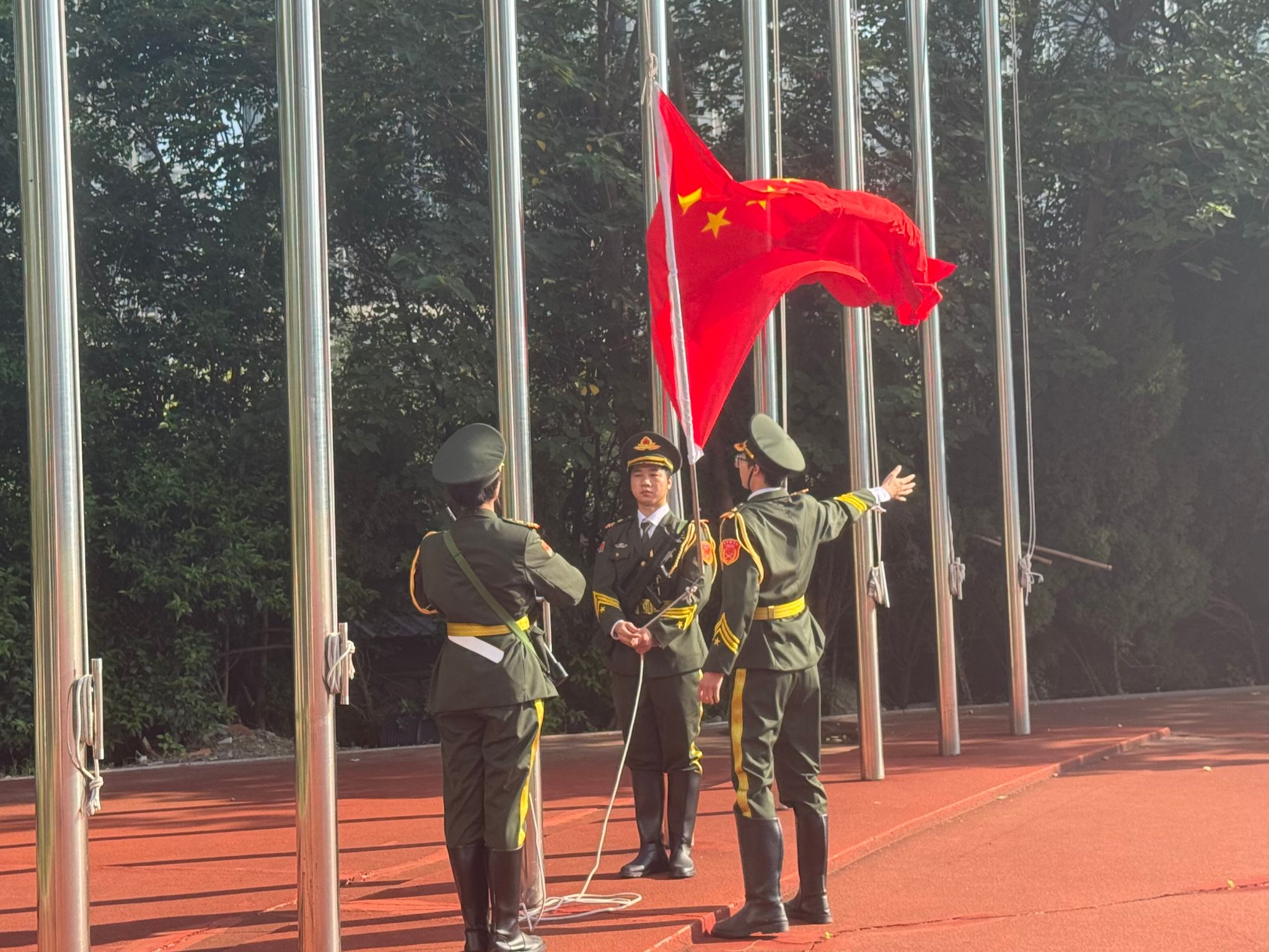 7时20分,学校国旗护卫队迈着整齐有力的步伐,护卫着五星红旗走向升旗台,他们身姿挺拔,目光坚定,每一步都彰显着对党的忠诚与敬意。激昂的国歌奏响,升旗手振臂一挥,在朝阳的映照下,鲜艳的五星红旗冉冉升起。全体师生庄严肃立,面向国旗行注目礼,每个人的眼中都闪烁着激动与自豪的光芒。国歌声在运动场上空久久回荡,仿佛诉说着中国共产党百年来的奋斗历程和辉煌成就。