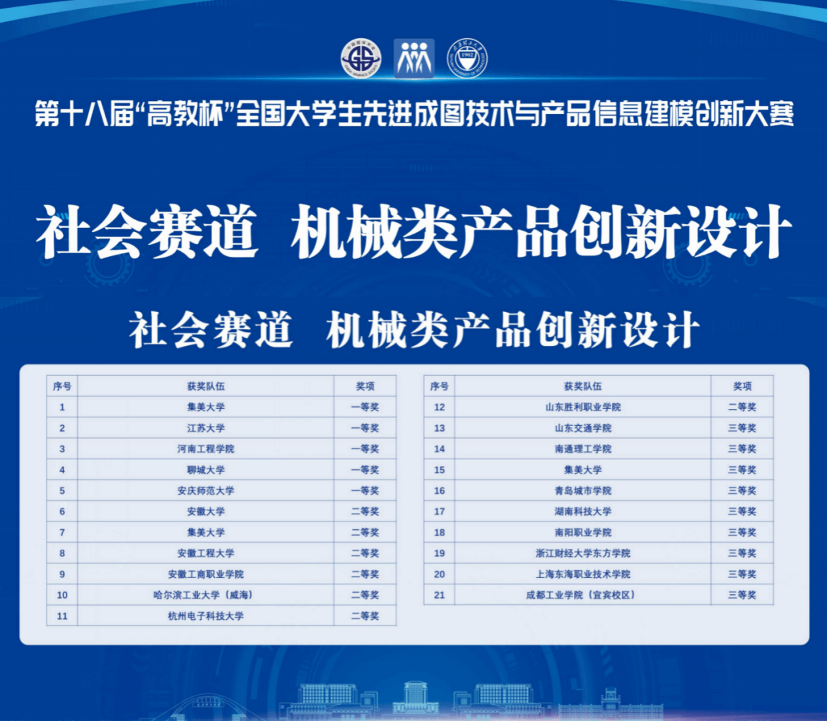 7月28日下午,第十八届“高教杯”全国大学生先进成图技术与产品信息建模创新大赛在太原理工大学圆满落幕。本届大赛吸引了包括“双一流”高校在内的1001所院校近4000名精英学子同场竞技。安徽工商职业学院智能制造与汽车学院代表队凭借过硬的个人专业能力与综合素质在省赛选拔赛中脱颖而出,在全国总决赛中荣获二等奖,高职院校排名全国第一。该赛项指导教师胡世平、徐慧敏。