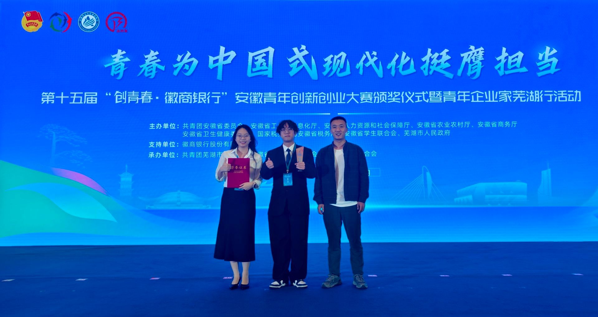 近日,第十五届 “创青春?徽商银行” 安徽青年创新创业大赛在芜湖市圆满落幕。此次大赛由团省委联合省工信厅、省人社厅、省农业农村厅、省商务厅、省卫健委、省税务局、省学联及芜湖市人民政府共同主办,自9月25日启动至26日结束,汇聚了全省各领域青年创新创业力量,成为展现安徽青年创新风采的重要平台。