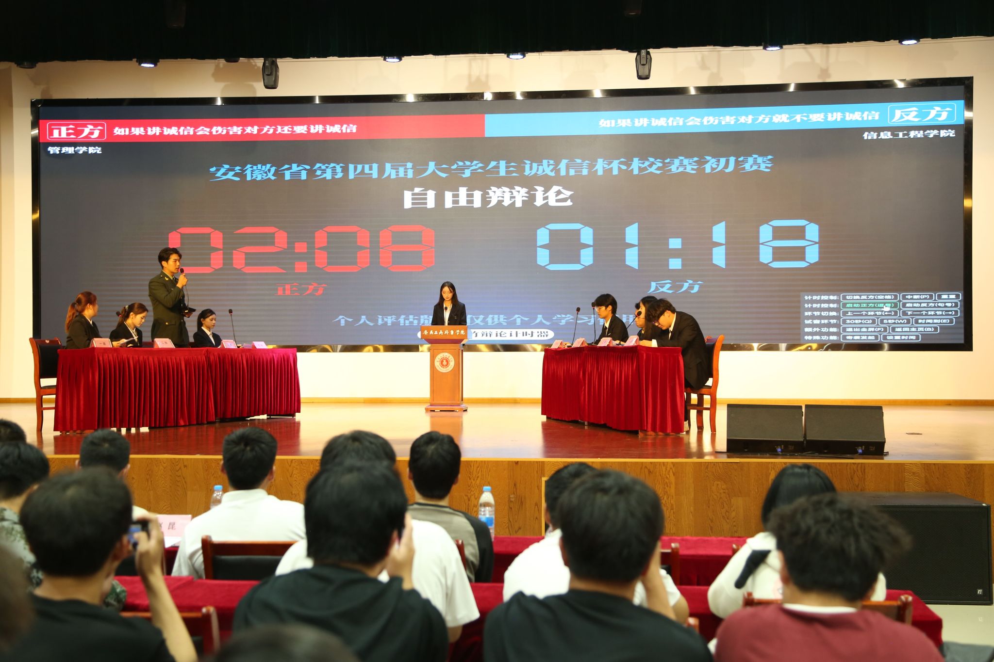 初赛聚焦:剖析现实,探微知著。首轮交锋于9月25日打响,三场辩论引人入胜。管理学院与信息工程学院围绕“善意的谎言”展开伦理激辩,探讨“若讲诚信会伤害对方,还要不要讲诚信”;经济贸易学院与艺术设计学院则针对“伪贫困生”这一校园失信现象,就“教育为先还是惩戒为先”进行策略博弈;旅游健康学院与会计学院聚焦电商新风潮,辨析“直播带货中的诚信问题,主播自查与平台监管孰更重要”。辩手们才思泉涌,展现了丰厚的知识储备与敏锐的洞察力。