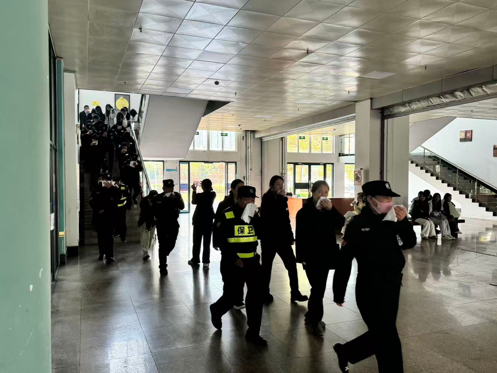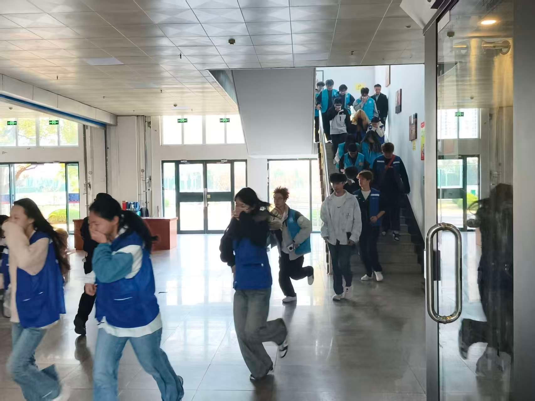 15时10分,随着学校应急广播信号的响起,消防应急疏散演练环节正式拉开帷幕。本次演练模拟场景设定为图书馆二楼突发火情,迅速释放烟雾,营造出突发火情的逼真氛围。随着“火灾警报”拉响,现场立即启动应急疏散预案。在消防安全员的引导下,模拟疏散人员用湿毛巾捂住口鼻,沿楼梯迅速、有序地撤离至图书馆外的安全集合点。整个疏散过程紧张有序、反应迅速、通道畅通、组织严密,所有参与人员均在预定时间内安全撤离,达到了预期的演练效果。