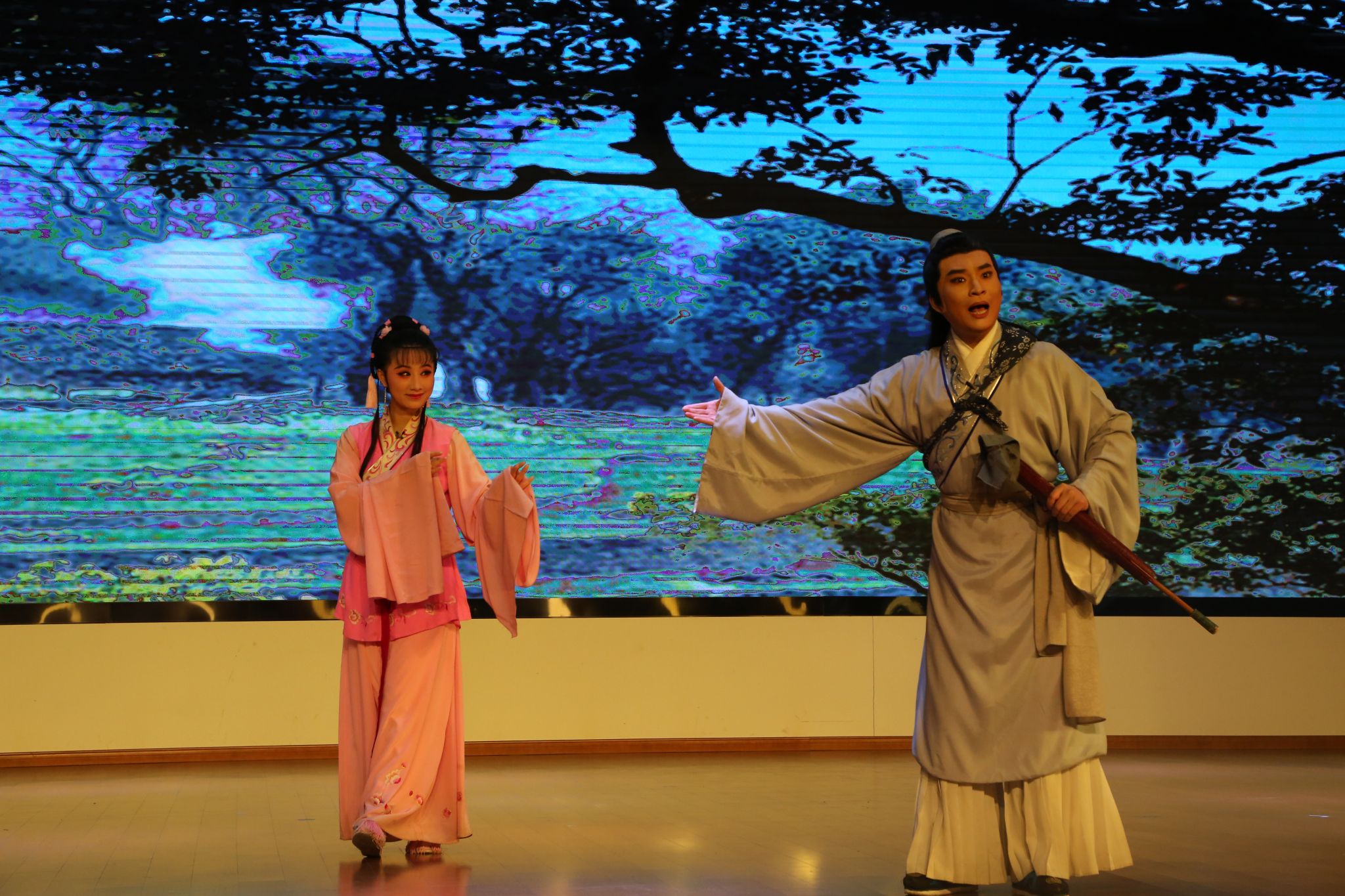 本场演出名家荟萃,精彩纷呈。活动在黄梅歌《山野的风》悠扬的旋律中拉开帷幕,国家一级演员白玉兰主角奖获得者夏圆圆的演唱清丽婉转,瞬间将观众带入黄梅戏的艺术世界;随后,黄梅小戏《夫妻观灯》妙趣横生,以其诙谐生动的表演赢得了满堂彩;第十八届文华表演奖获得者虞文兵带来的《太阳山上》选段《新四军的好儿郎》,唱腔铿锵,尽显革命者的豪情壮志;而由优秀青年演员黄小可、汪春霖演绎的《梁祝·十八里相送》,则缠绵悱恻,将古典爱情的唯美与哀婉表现得淋漓尽致。此外,黄梅小戏《戏牡丹》以及经典对唱《海滩别》、《夫妻双双把家还》等节目也各具特色,精彩不断。整场演出掌声、喝彩声此起彼伏,现场气氛热烈,演员们深厚的艺术功底和饱满的舞台热情深深感染了在场师生。