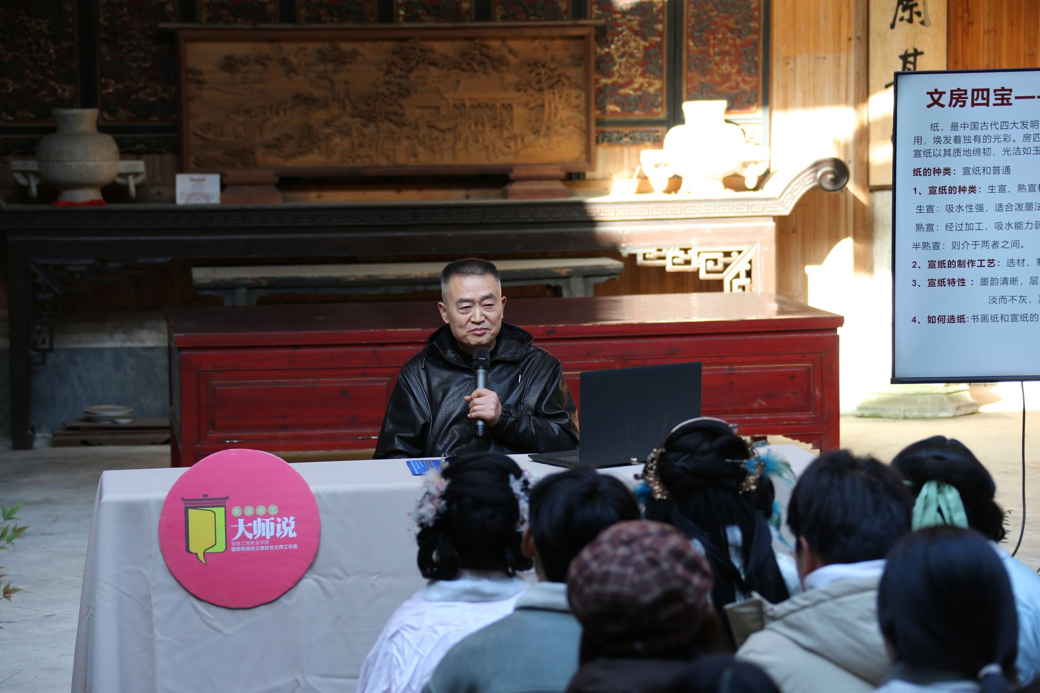 活动伊始,康本银先生以《千年风雅,当代新生——徽州文房四宝的传承与创新》为题,开启了本次风雅之旅。作为中国书法家协会会员,康本银先生早年深厚的考古研究背景,尤其是对秦砖汉瓦图文的深入研究,赋予了他独特的艺术视角。他从古文字的源流与形态演变谈起,结合自身在书法、绘画及摄影艺术上的跨界实践,深刻阐释了徽州文房四宝所承载的文化精神及其在当代社会中的创新路径。他提出,传统的生命力在于融入时代,唯有在传承中大胆创新,方能令千年风雅历久弥新。