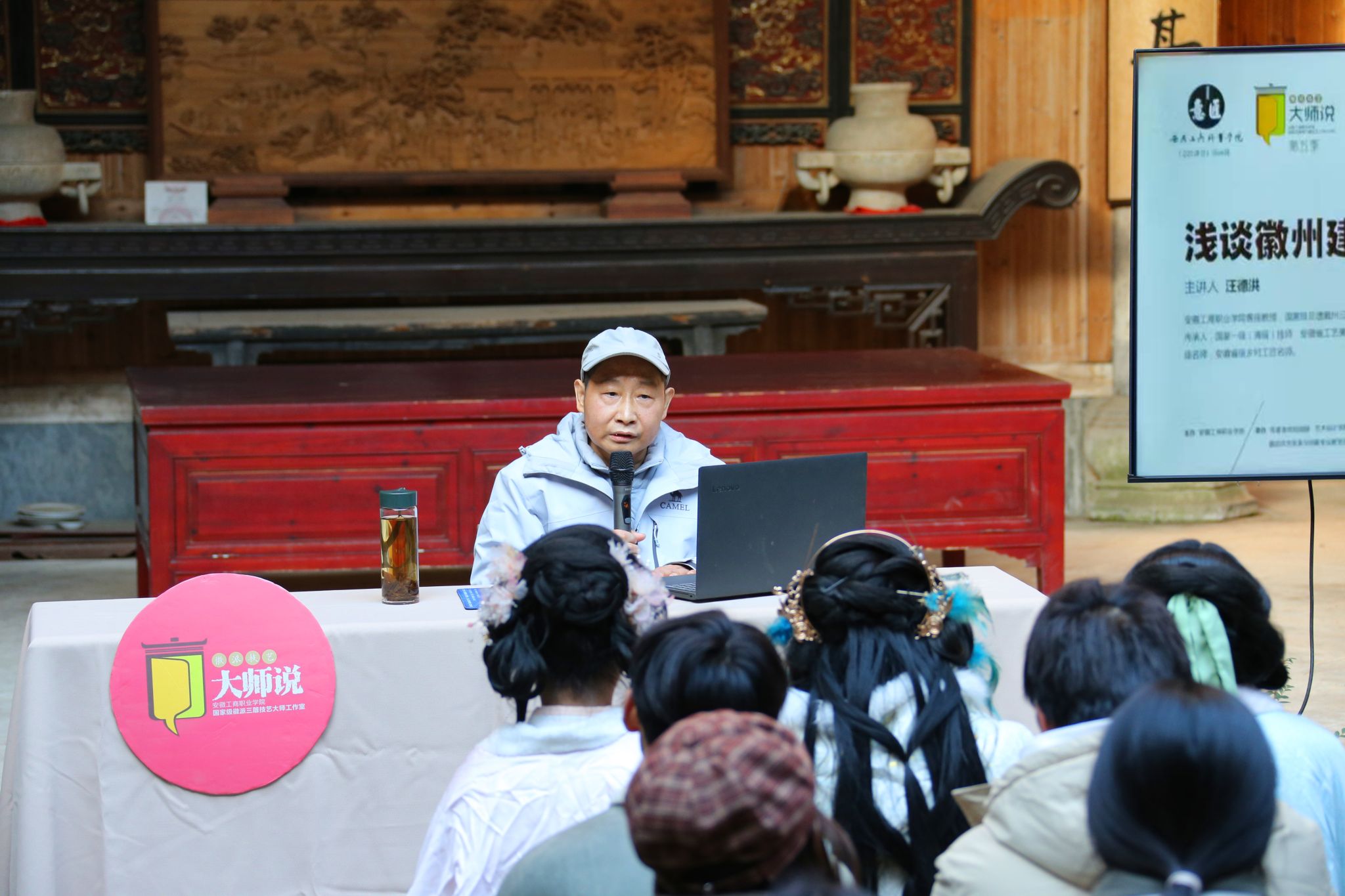 随后,国家级非遗徽州三雕(木雕)安徽省级非遗传承人、安徽省工艺美术大师汪德洪先生带来了题为 《浅谈徽州建筑的木雕装饰艺术》 的精彩讲座。作为安徽工商职业学院国家级大师工作室首席大师和高级工艺美术师,汪德洪先生以其数十年的雕刻实践与教学经验,为现场师生生动解读了徽州木雕的技艺精髓与文化内涵。他从刀法、构图、寓意等多个维度,层层剖析了徽州古建筑中木雕装饰的艺术魅力,展现了匠人如何将质朴的木材转化为讲述徽州故事、寄托家族理想的艺术珍品,并分享了其在技艺传承与人才培养方面的宝贵心得。