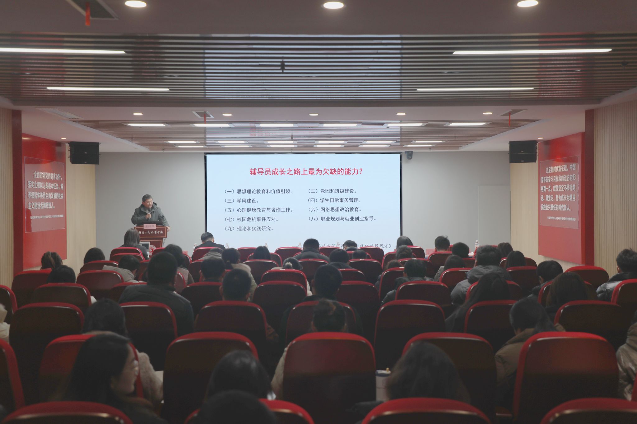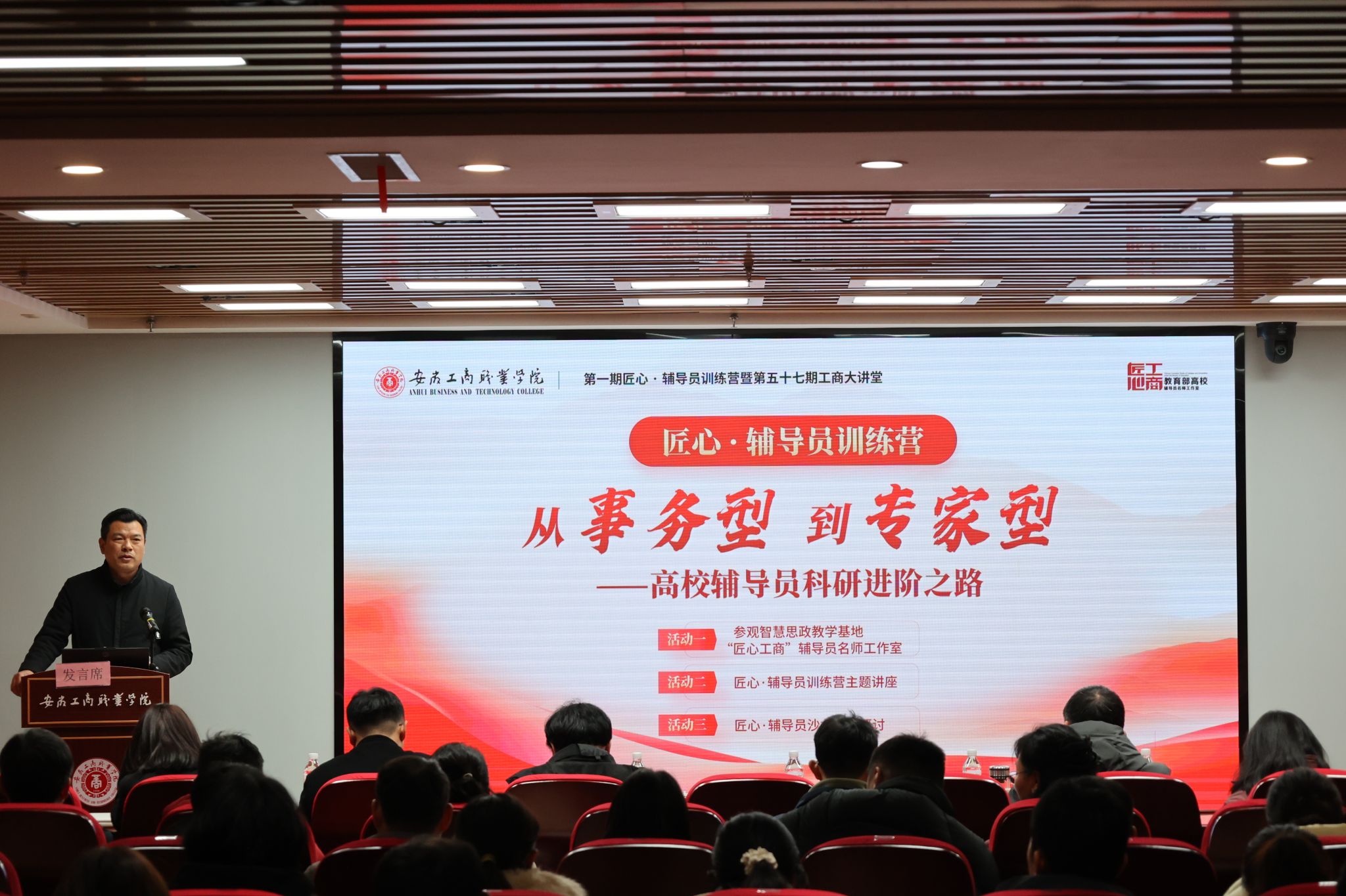 2025年12月24日下午,安徽工商职业学院智慧思政实践教学基地红色报告厅内气氛热烈,学校第一期“匠心·辅导员训练营”暨第五十七期“工商大讲堂”隆重举行。本次活动由教育部“匠心工商”辅导员名师工作室牵头承办,并联合安徽理工大学(合肥校区)、安徽国际商务职业学院、安徽新闻出版职业技术学院共同协办。安徽省教育厅相关处室领导、安徽工商职业学院校领导、四所学校学工部门负责人、部分二级学院党政领导及专职辅导员代表近百人齐聚一堂,围绕辅导员队伍专业化、专家化发展路径,开展深入研讨与交流,共同描绘新时代高职院校思政工作高质量发展新图景。