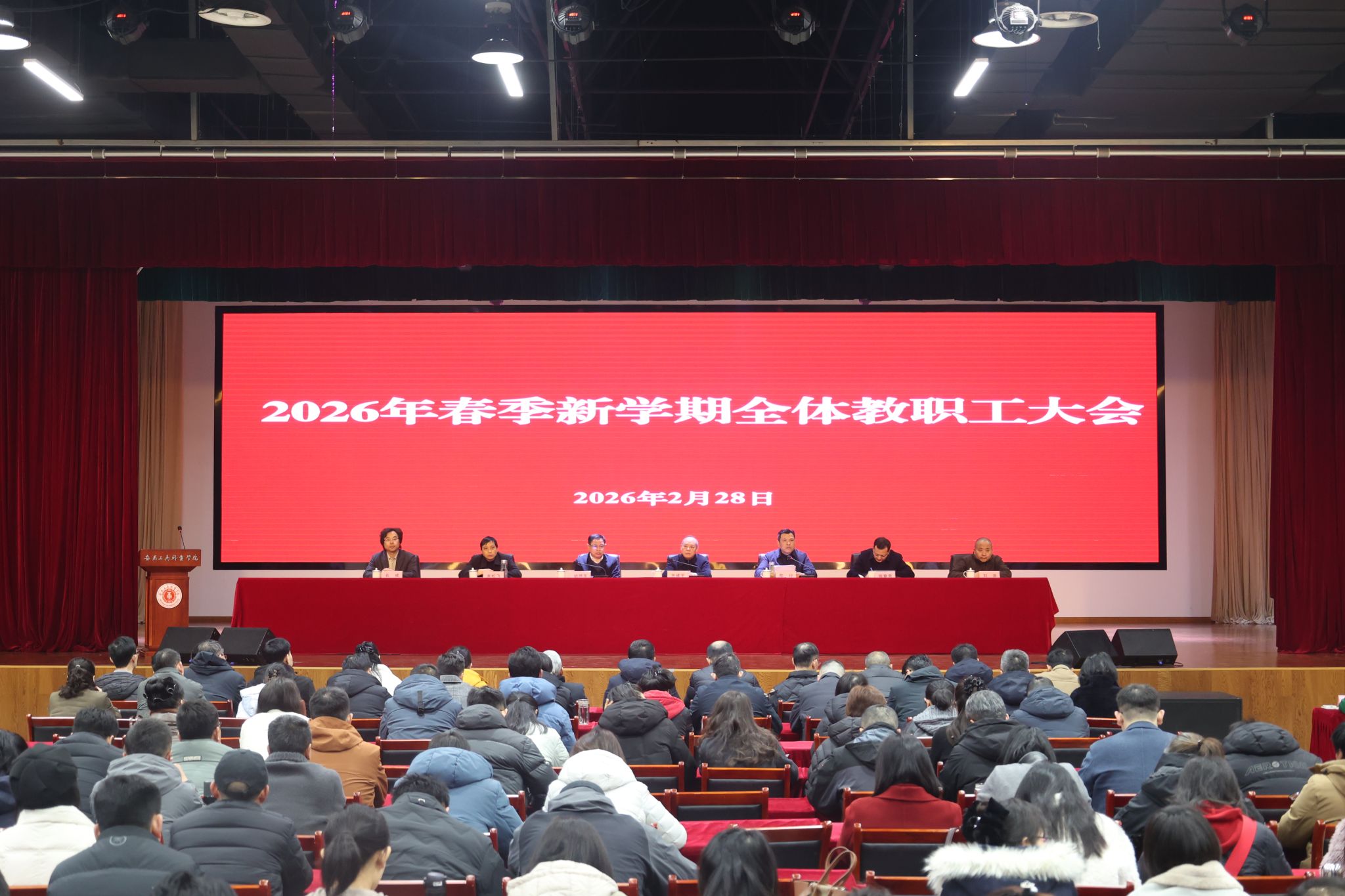 2月28日上午,学校召开2026年春季学期工作会议,贯彻落实2026年全省教育工作会议精神,总结2025年及“十四五”时期学校各项工作,部署2026年及今后一个时期重点工作任务,奋力实现“十五五”高质量开局起步。校领导班子成员齐建平、陈行、胡捍东、陈章奇、吴松飞、刘浩、孔成出席,全体教职工参加。党委副书记、校长陈行代表学校党政领导班子作工作报告,党委书记齐建平作总结讲话,党委委员、副校长胡捍东主持会议。