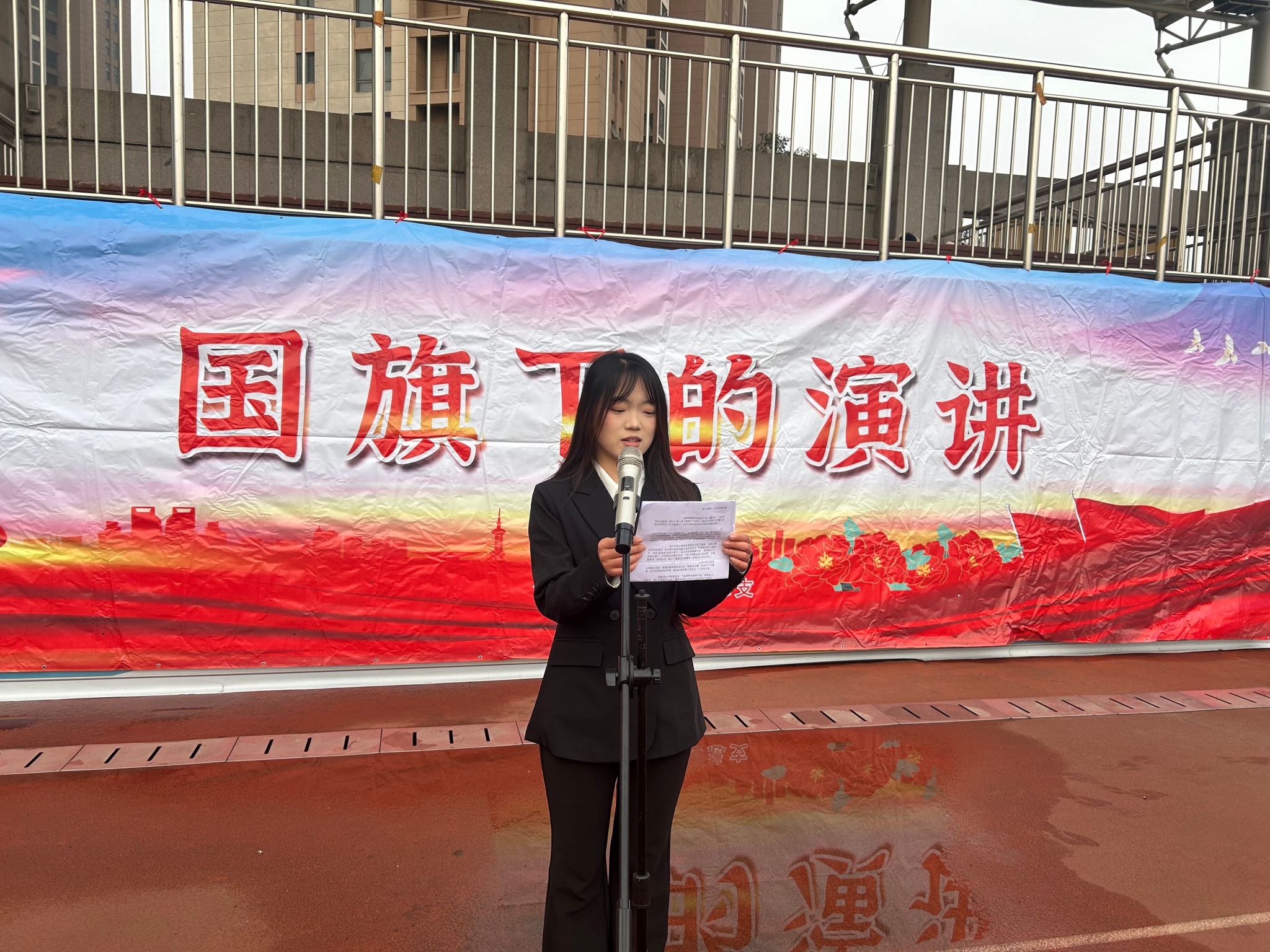 7时20分整,国旗护卫队迈着铿锵有力的步伐,护送鲜艳的五星红旗走向升旗台。在雄壮激昂的国歌声中,全体师生行注目礼,齐声高唱国歌。