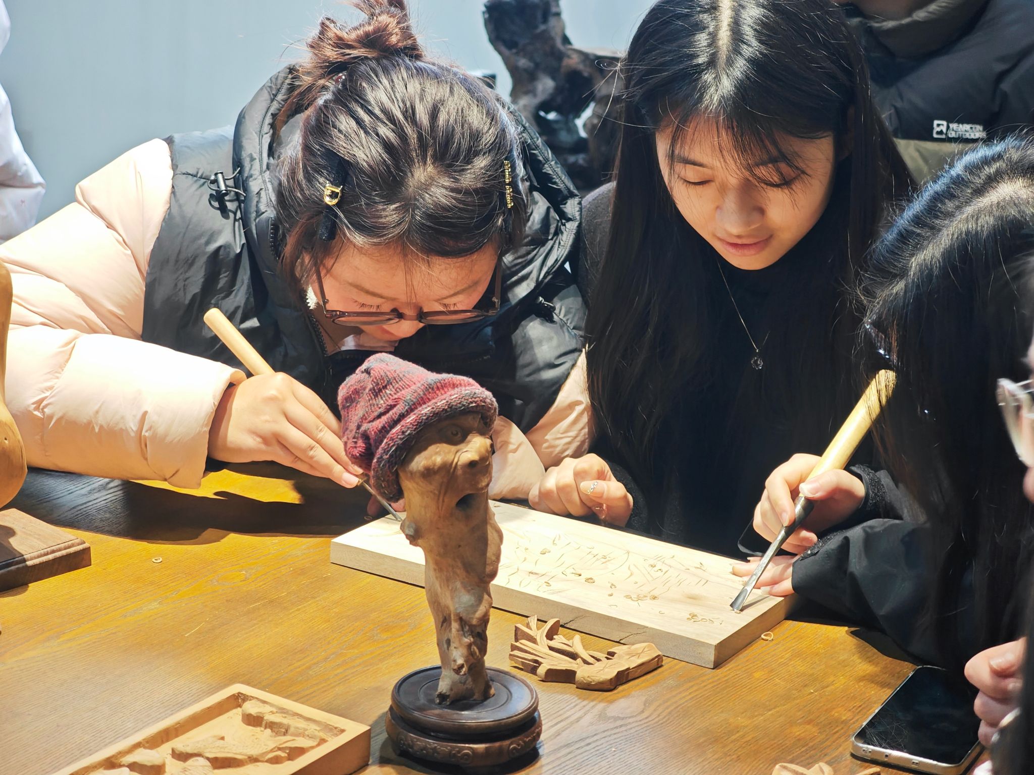 在工作坊环节,丁勇刚现场演示木雕的雕刻工艺流程,从选材、画稿、粗坯到细雕、修光,逐一讲解,边示范边讲授。他手持刻刀,沉稳运刀,木屑轻落间,纹样渐显。学生们围坐其间,目不转睛,跃跃欲试。在丁勇刚的指导下,部分学生亲身体验了木雕的基础雕刻技法,虽只是简单的几刀,却真切感受到徽派技艺的细腻与厚重。“亲手刻下去的那一刻,才明白什么叫‘一刀一世界’。”一位参与体验的学生感慨道。