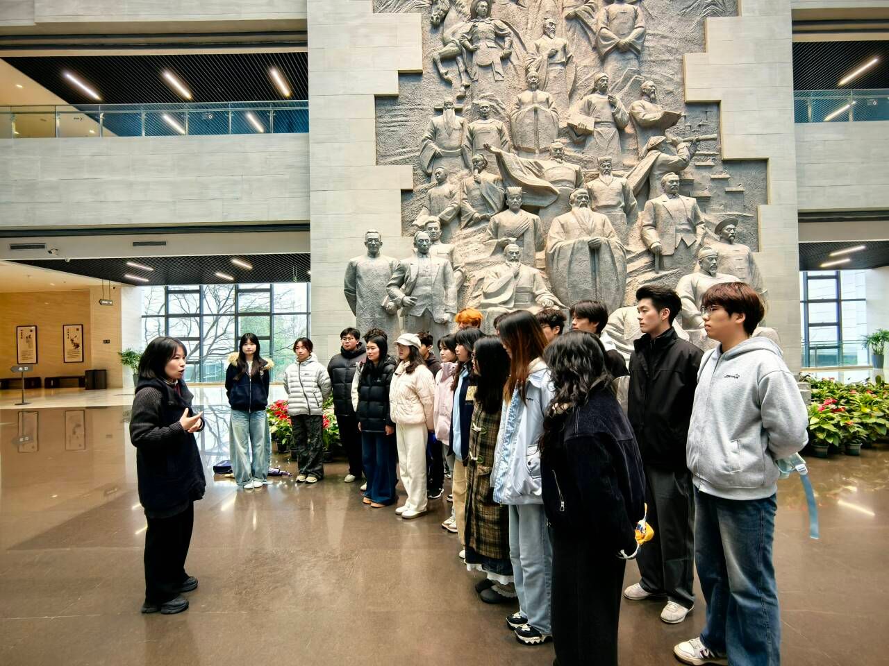 实景课堂开讲,思政入脑入心。参观过程中,一场别开生面的“行走的思政课”在各展厅内同步展开。哈春浪主任驻足于大禹治水的浮雕前,深情讲述了中华民族自古以来坚韧不拔、无私奉献的精神品格;林莉主任以徽商文化为切入点,引导同学们理解“贾而好儒”背后的诚信之道与社会责任;陈慧书记则聚焦革命先烈和科学家的感人事迹,激励青年学子传承红色基因,勇担时代使命。老师们旁征博引、娓娓道来,将历史的厚度与思想的深度融入鲜活的场景之中,让原本静止的文物“开口说话”,让思政教育在潜移默化中入脑入心。