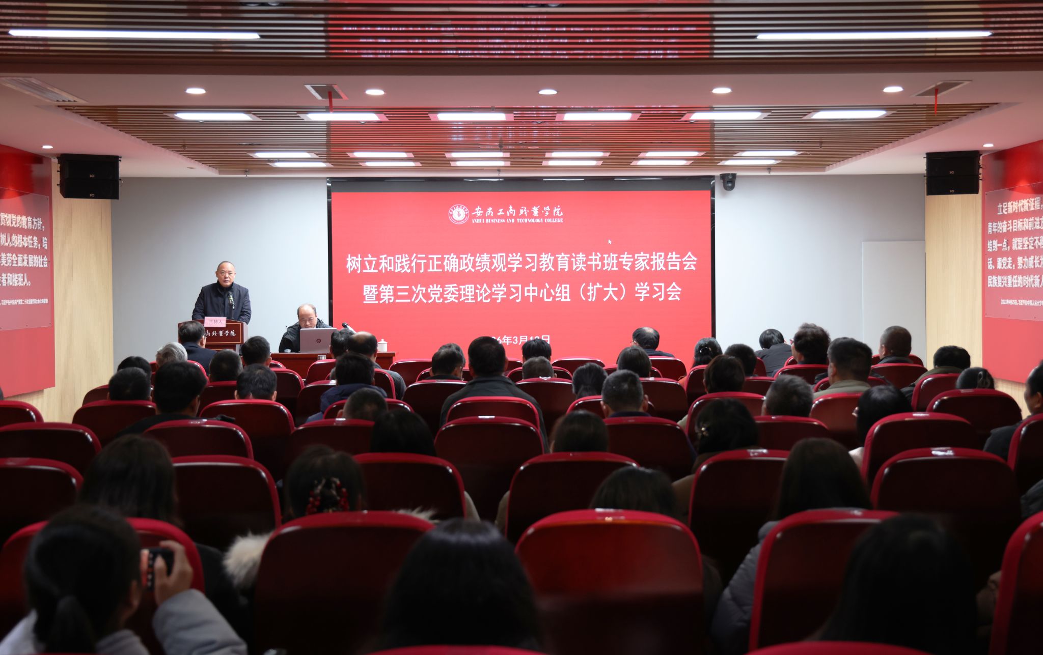 3月18日下午,校党委召开树立和践行正确政绩观学习教育读书班专家辅导报告会暨2026年第三次党委理论学习中心组(扩大)学习会。特邀省委讲师团理论宣讲专家库宣讲专家、安徽省社科联秘书长、一级调研员韩修良同志作学习教育专题辅导报告。党委书记齐建平主持会议。校党委领导班子成员出席会议,各二级党组织书记、纪检委员,全体中层干部,各党支部书记参加学习会。