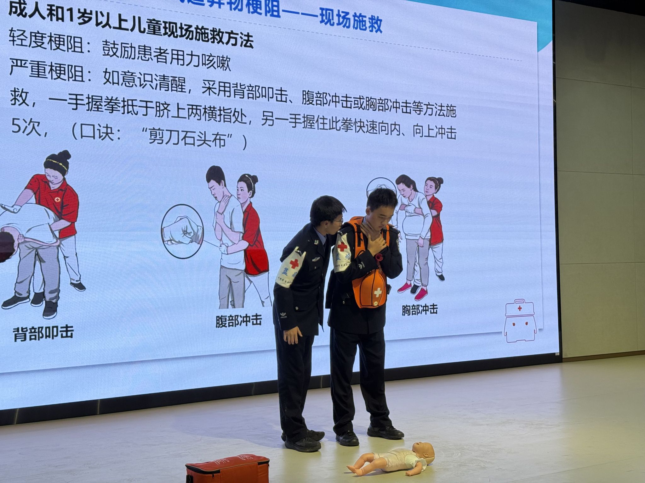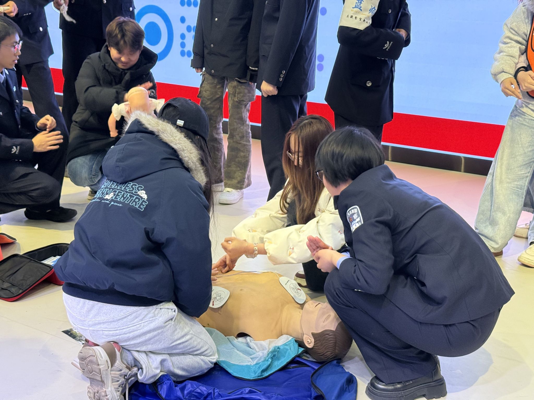 实战“练兵”:急救技能握在手中。培训团队利用人体模型、医用绷带、三角巾、AED训练机等专业教具,分组开展“手把手”教学。在心肺复苏教学环节,志愿者详细讲解了按压位置、深度、频率等关键参数,并利用人体模型进行分步演示。随后,同学们在志愿者的指导下逐一进行实操练习,从判断意识、呼救求援到胸外按压、人工呼吸,力求每一个动作规范到位。在创伤包扎环节,志愿者展示了环形包扎、螺旋包扎、“8”字包扎等常用方法,并邀请同学上台互动,现场气氛热烈。