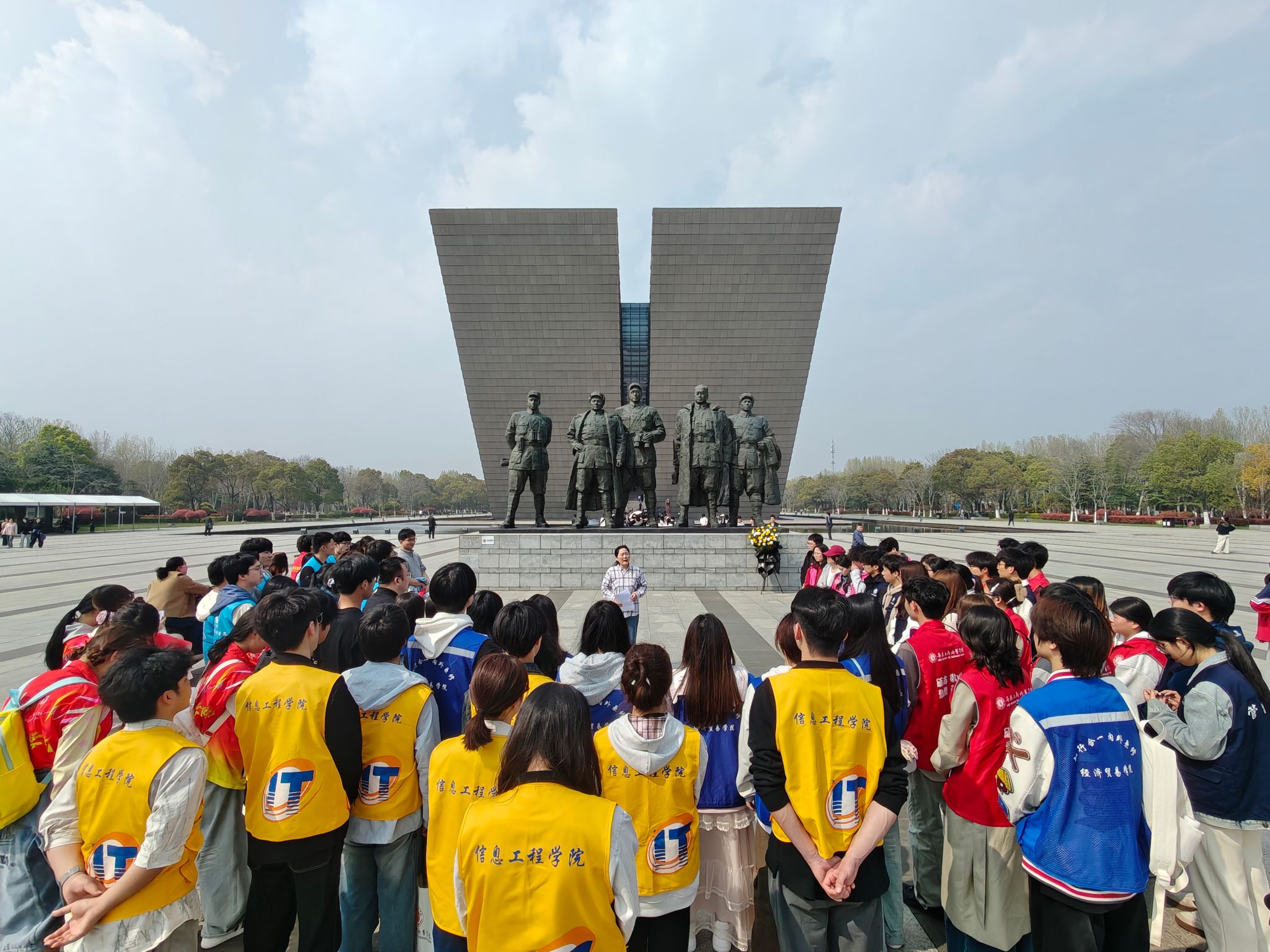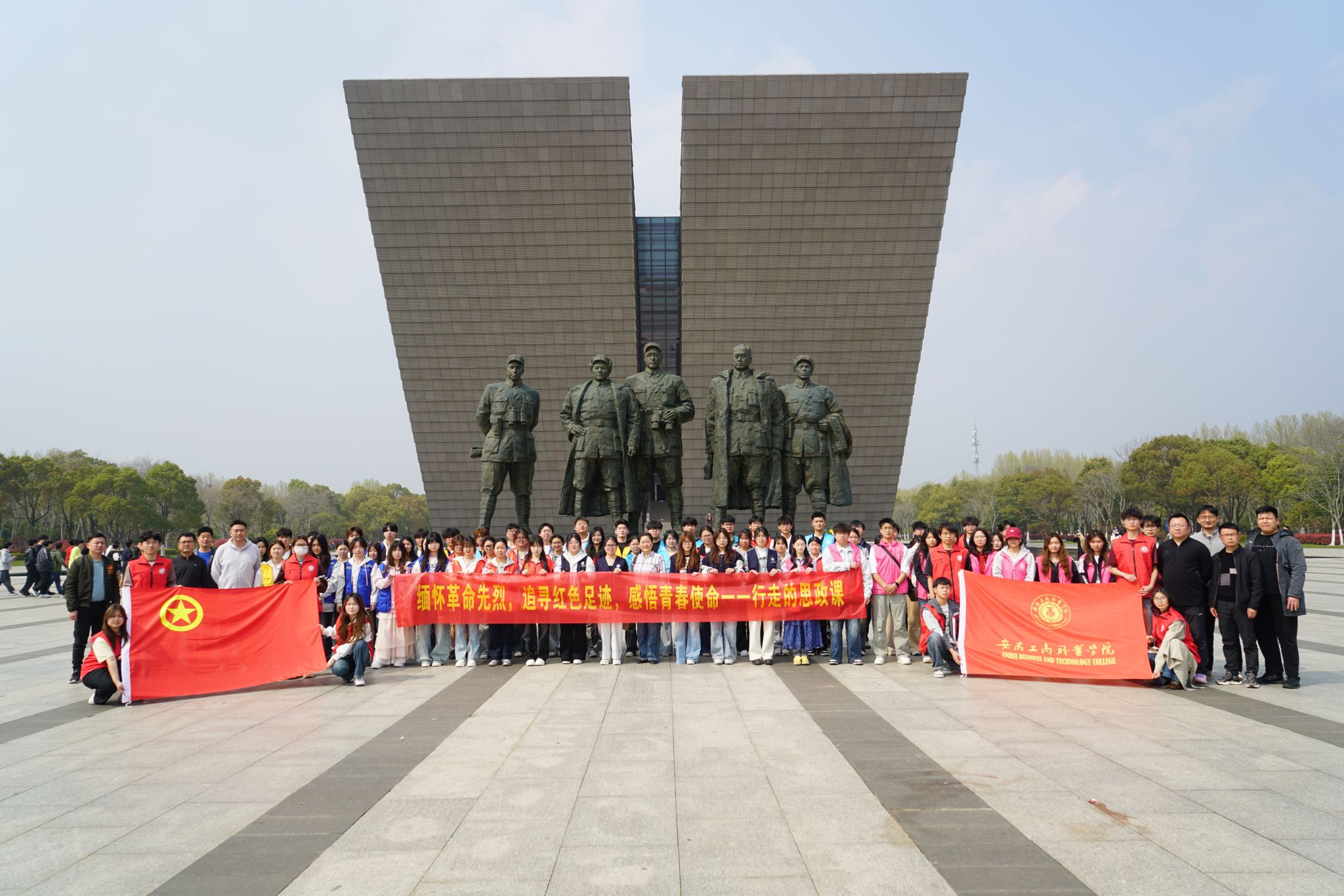苍松翠柏间,渡江战役总前委群雕巍然矗立。活动伊始,喻小红在纪念馆前讲授现场思政课,结合渡江战役历史背景与精神内涵,深情回顾人民解放军百万雄师突破长江天险的壮阔历程,深刻阐释“坚定信念、革命到底;军民团结、奋勇争先;攻坚克难、勇于牺牲”的渡江精神,勉励青年学子铭记历史、勇担使命,将个人理想融入国家发展伟业。现场气氛庄重热烈。