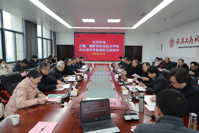 2月23日上午,安徽广播影视职业技术学院党委书记何其旺、院长徐振轩一行19人来我院调研交流工作。院领导齐建平、李雪、陈行、吴松飞在综合楼3号会议室进行了热情接待。办公室、党委宣传统战部、组织人事处、教务处、纪委办公室、资产设备管理处、后勤服务中心、信息化建设与发展处、信息工程学院、艺术设计学院等部门负责人参加接待。