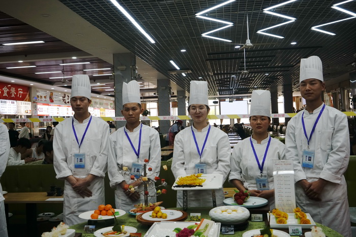 烹饪赛项为团队赛,每队5名参赛选手。比赛包含宴席设计书、宴席制作、宴席展评三个环节。通过宴席设计书策划、宴席作品制作、宴席展台效果等内容,检验参赛选手的现场设计与应变能力、营养搭配与计算能力、规范操作水平及创新创意能力和水平。一样样普通的食材在选手们的手中顷刻间变成了一件件“艺术品”,选手们精湛的厨艺让大家叹为观止。