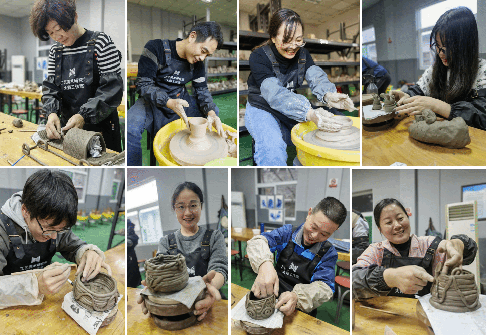 陶瓷系列培训过程中,安徽省工艺美术大师杨帆、全国技术能手余志贤和陶艺工作坊教师团队共同带领学员完成了陶瓷从泥坯成型到烧制成品的一条龙生产过程,具体包括:①盘条成型工艺学习与实践②捏塑成型工艺学习与实践③拉坯成型工艺学习与实践④修坯工艺学习与实践⑤模制成型工艺学习与实践⑥青花工艺学习与实践⑦施釉工艺学习与实践⑧烧窑工艺学习与观摩,培训内容全面、系统、专业、生动。