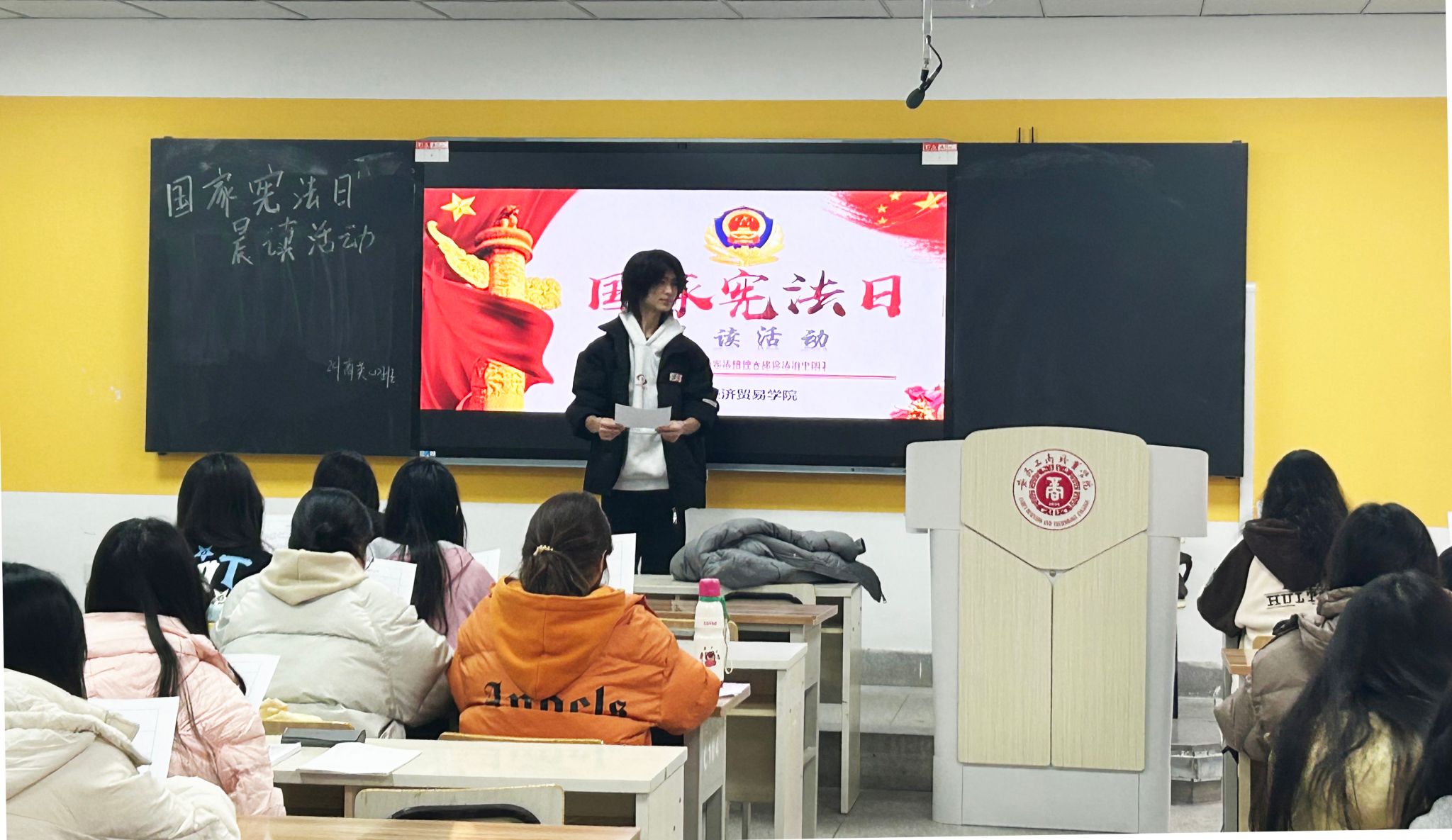 学宪法,生生入心。学院各班级召开学宪法主题班会,辅导员结合宪法案例,为同学们讲述了宪法的基本知识以及维护宪法的重要意义,加强同学们对宪法的理解。跨境电子商务2024级4班的余雪飞说到:“作为新时代的青年,我们应该积极学习宪法,不断提高自己的法治素养和综合能力,学会维护自己的合法权益,更要积极参与到社会建设中来,共同推动法治社会的进步。”