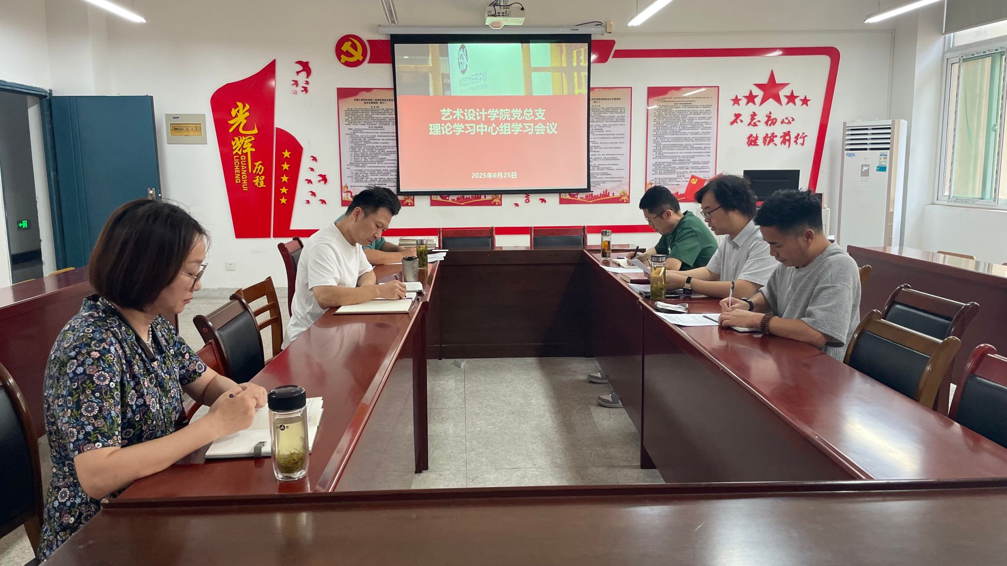 6月25日上午,艺术设计学院党总支在致知楼党员活动室召开理论学习中心组学习会议,校党委委员、党委宣传统战部部长、艺术设计学院党总支书记孔成,艺术设计学院党总支副书记张乐,副院长邱志斌及学院党总支委员参加学习。