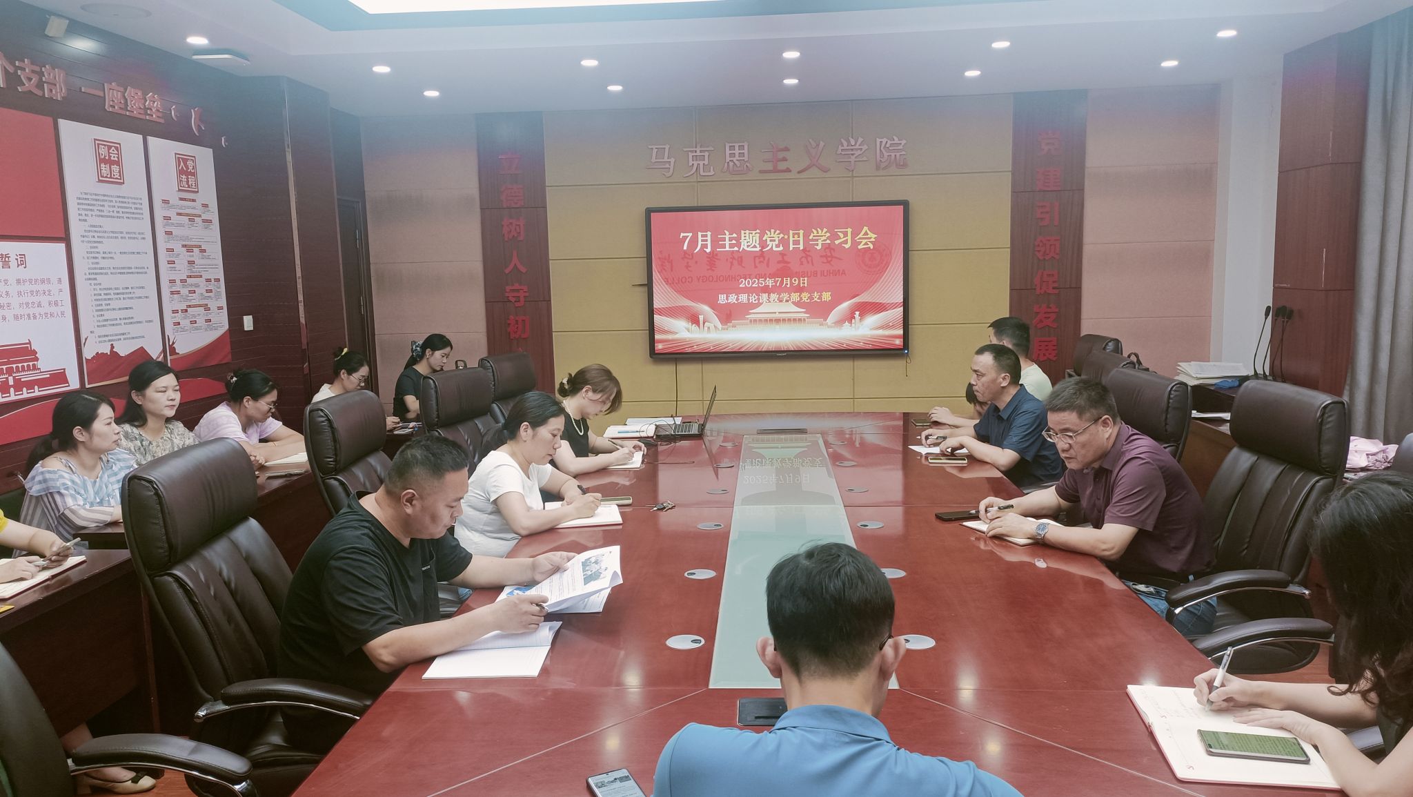 7月9日,思政课党支部开展7月主题党日学习会,集体学习习近平总书记在中共中央政治局第二十一次集体学习时的重要讲话精神、习近平总书记重要文章《团结奋斗是中国人民创造历史伟业的必由之路》,学习省委书记梁言顺在深入贯彻中央八项规定精神学习教育专题党课报告会上的讲话精神。