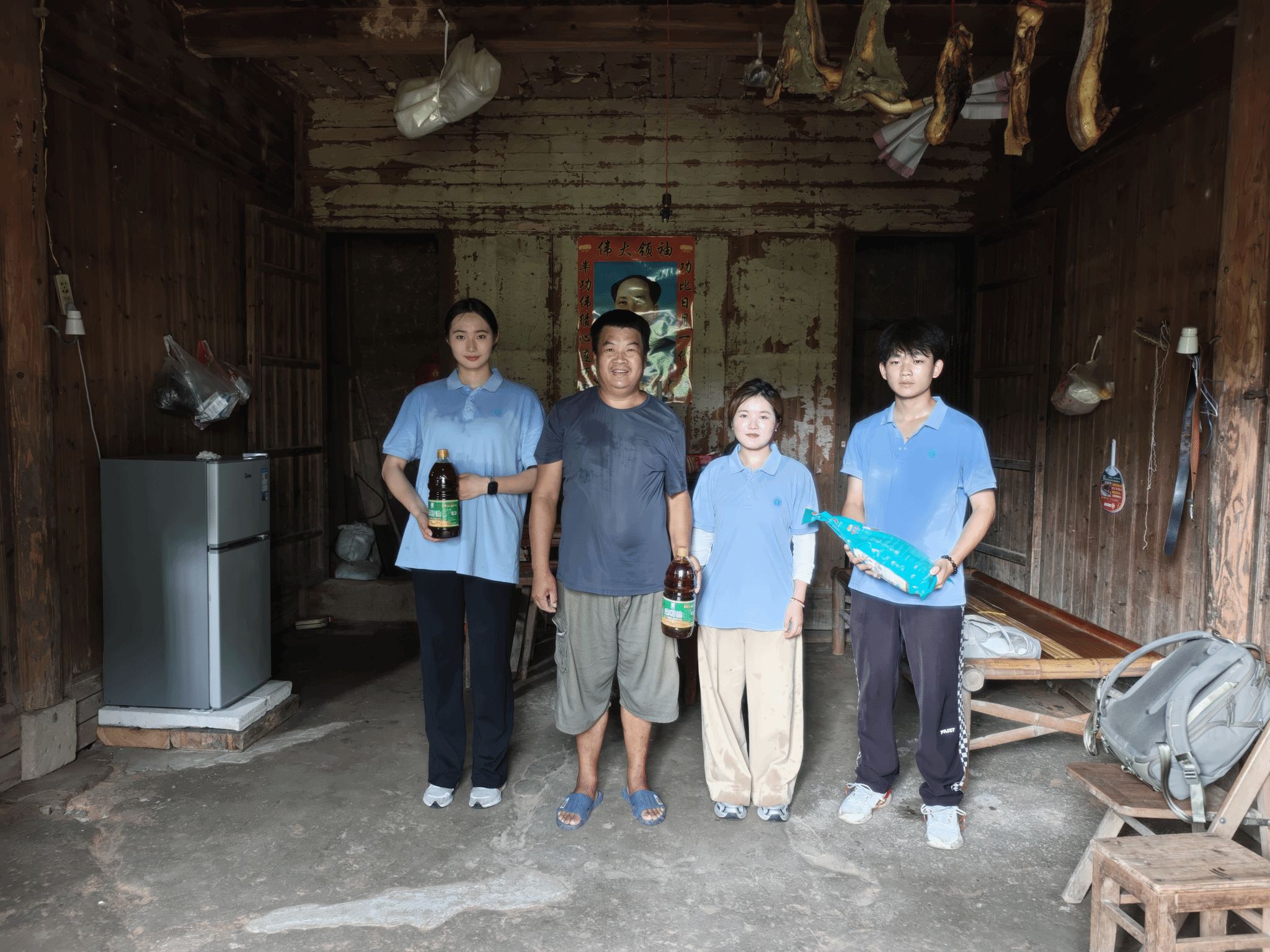 社会实践期间,团队还开展一系列丰富多彩的志愿服务活动。在村干部的带领下,团队深入山林腹地看望困难村民,并给他们送去了爱心物资,志愿者与他们聊起家常,热情地询问身体状况、生活情况。团队还专门开展了“给老人拍张照”志愿活动。快门按下,一张张饱经风霜的笑脸和一双双充满故事的双眼就此定格,同学们将打印好的照片送到老人手上,温情跃然纸上。