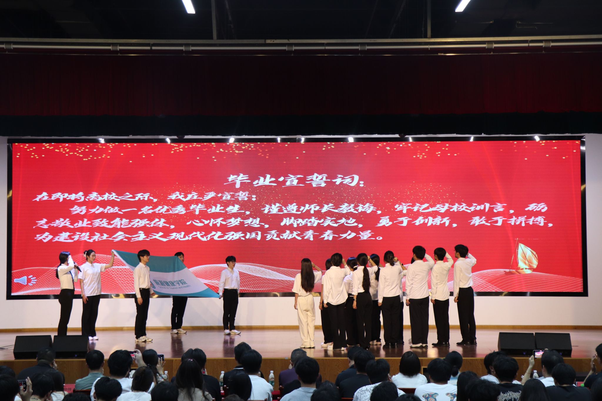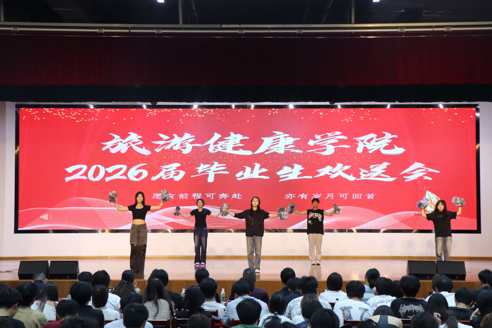随后一段回忆青春过往的短视频将本次活动带入了中篇《毕业情深》。同学用精心准备的节目敬奉逝去的青春,送别远行的学子。啦啦操《舞动青春》、手语舞《勇往直前》、歌曲串烧《纪念》依次呈现,同学们用舞姿、用音乐、用歌喉诉说着浓浓的师生情谊,追忆着满满的青春记忆。在下篇《青春起航》,2026届毕业生手持旅游健康学院院旗缓慢入场,全体师生向院旗致以崇高的敬意。毕业生代表集体宣誓,努力做一名优秀的毕业生,为建设社会主义现代化强国贡献青春力量。最后,学院全体领导老师集体登台,目送毕业生离场远行,全场高唱歌曲《亲爱的你啊》,师生们潸然泪下,相互挥手告别。