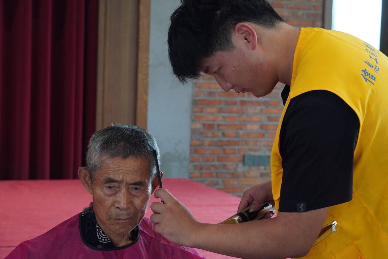 在村委会设置临时理发点,志愿者们自带设备,剪刀、刷子、围布…弯着腰、半蹲着、站立着…剪发、修理、清扫…微笑、招呼、聊天…他们为15名村民提供理发服务。体贴细致实惠的服务让村民们真切感受到温暖与关怀。