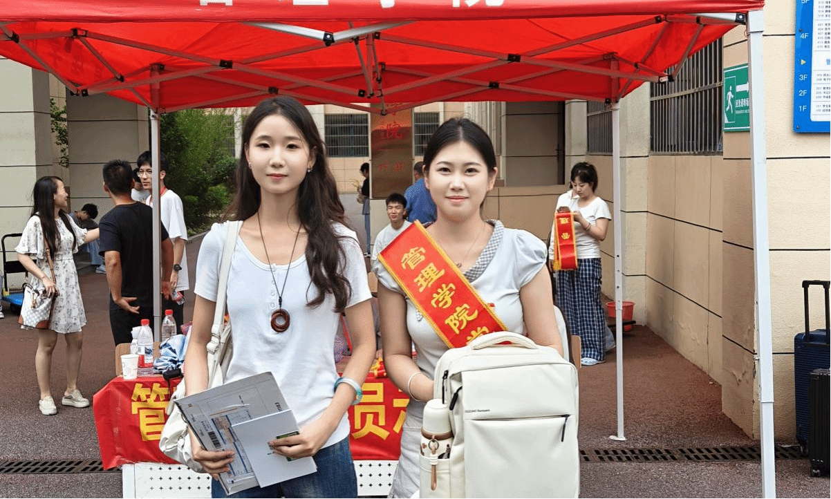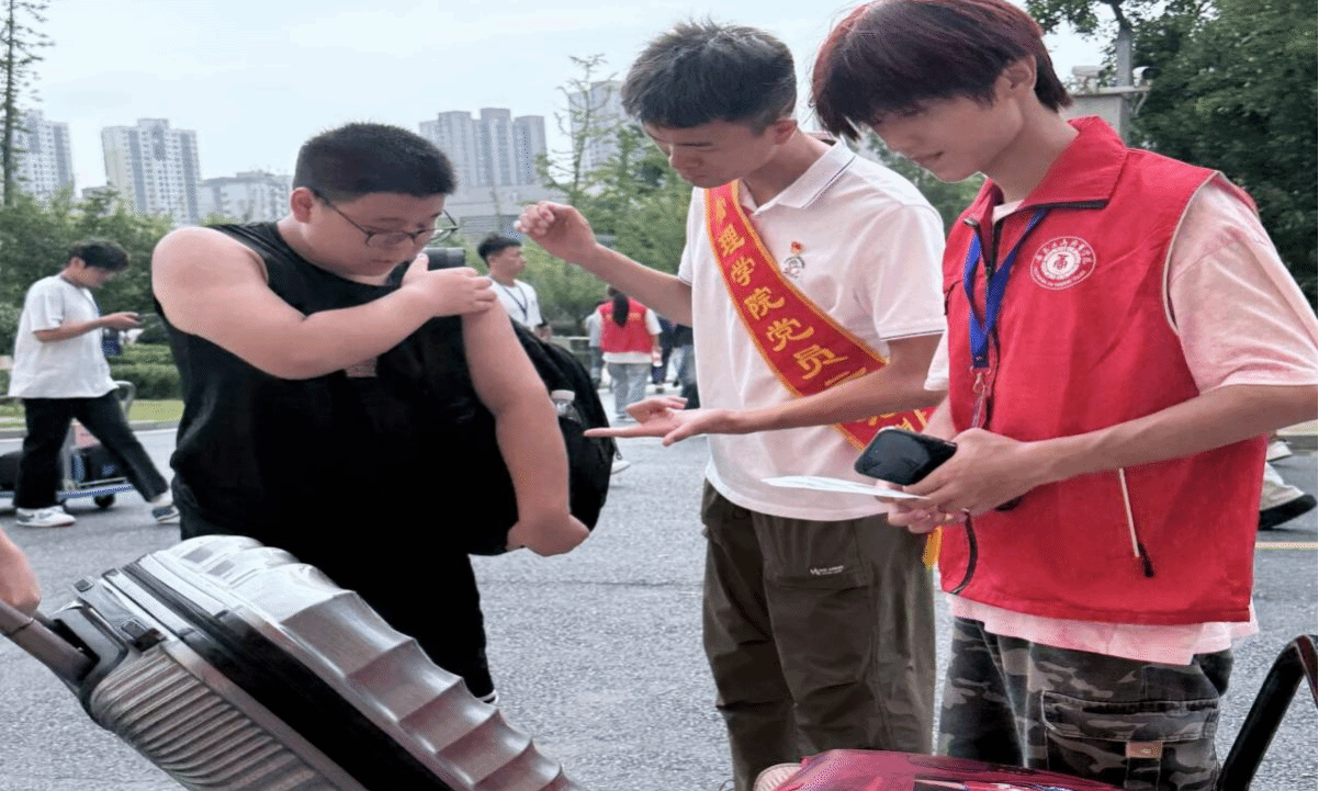 亮身份,践初心,红色服务暖人心。12日一早,管理学院楼下党员先锋岗的旗帜早已高高飘扬。来自学院学生党支部的10余名本专科党员佩戴党员绶带集合完毕。按照既定工作安排,为2025级新生提供一对一的引导服务、帮助新生搬运行李、解答入学手续办理疑问、引导进入宿舍等。