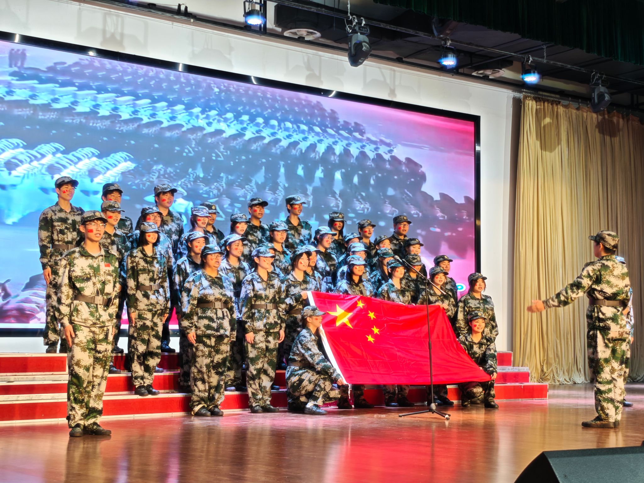 来自各班级的26支参赛队伍以饱满的热情、昂扬的姿态依次登台,用歌声演绎经典抗战曲目。《松花江上》《黄河大合唱》《保卫黄河》等作品气势恢宏,再现了中华儿女浴血奋战的壮丽史诗;《没有共产党就没有新中国》《歌唱祖国》《学习雷锋好榜样》《强军战歌》等曲目通过多声部合唱与创意编排,展现了在党的统一领导下,军民团结的智慧与力量;《如愿》《紫荆花盛开》《少年中国说》以深情旋律抒发新时代青年对先烈的缅怀,将现场气氛推向高潮。